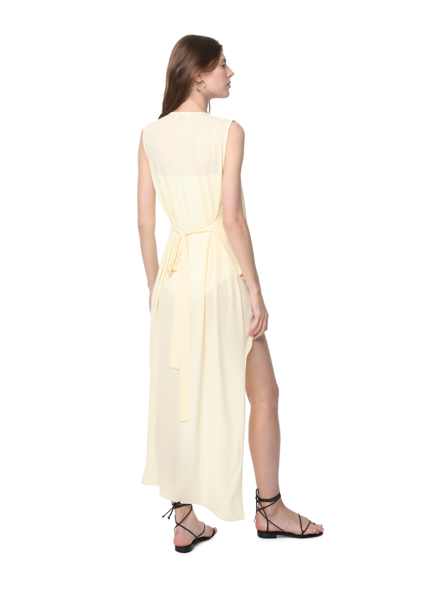 Angie Dress in crepe material, short in the front and longer at the back, belted and fitting all sizes.