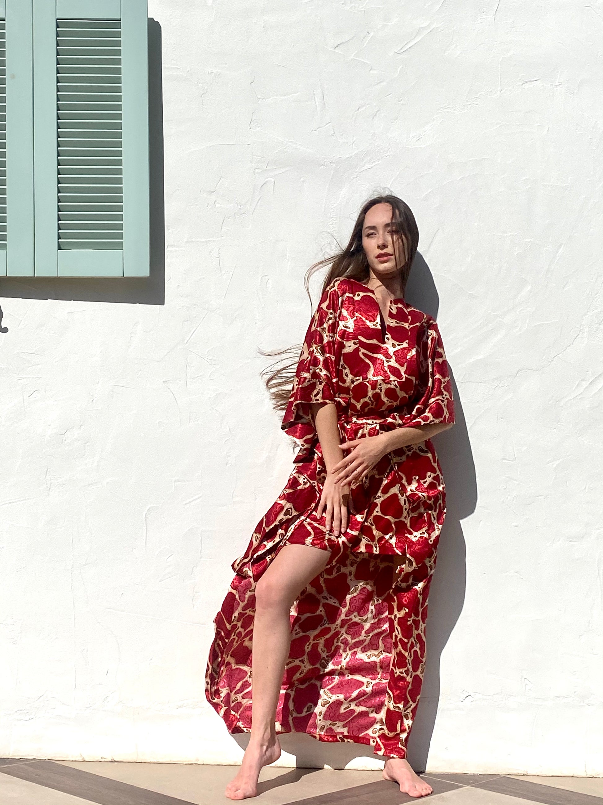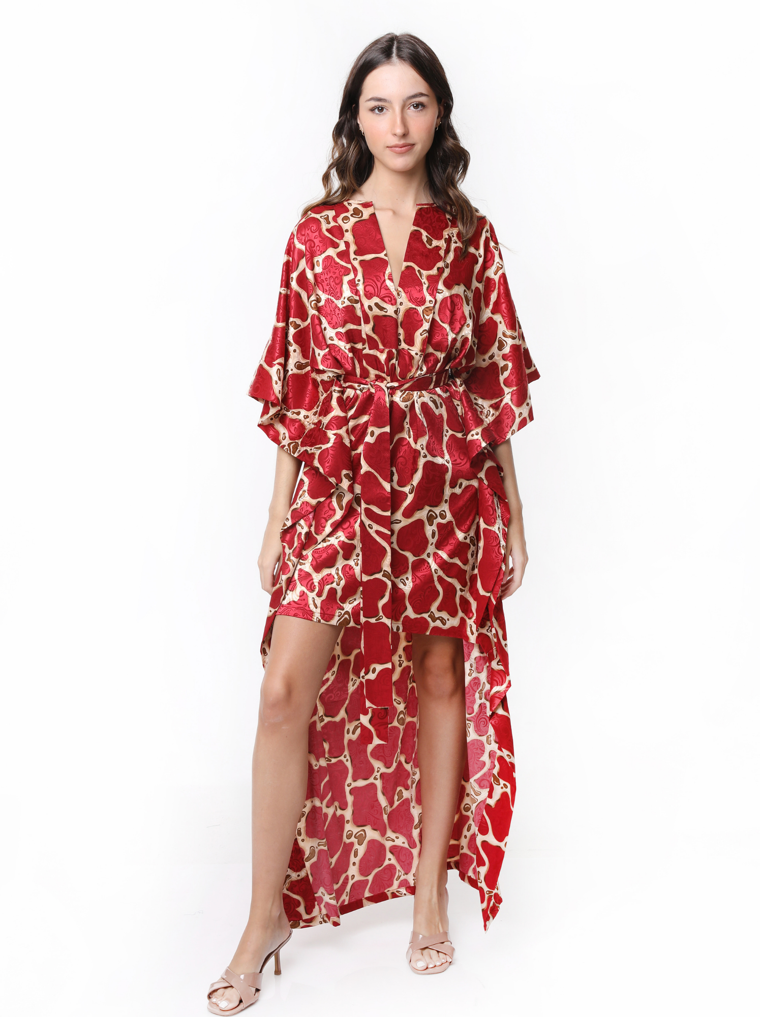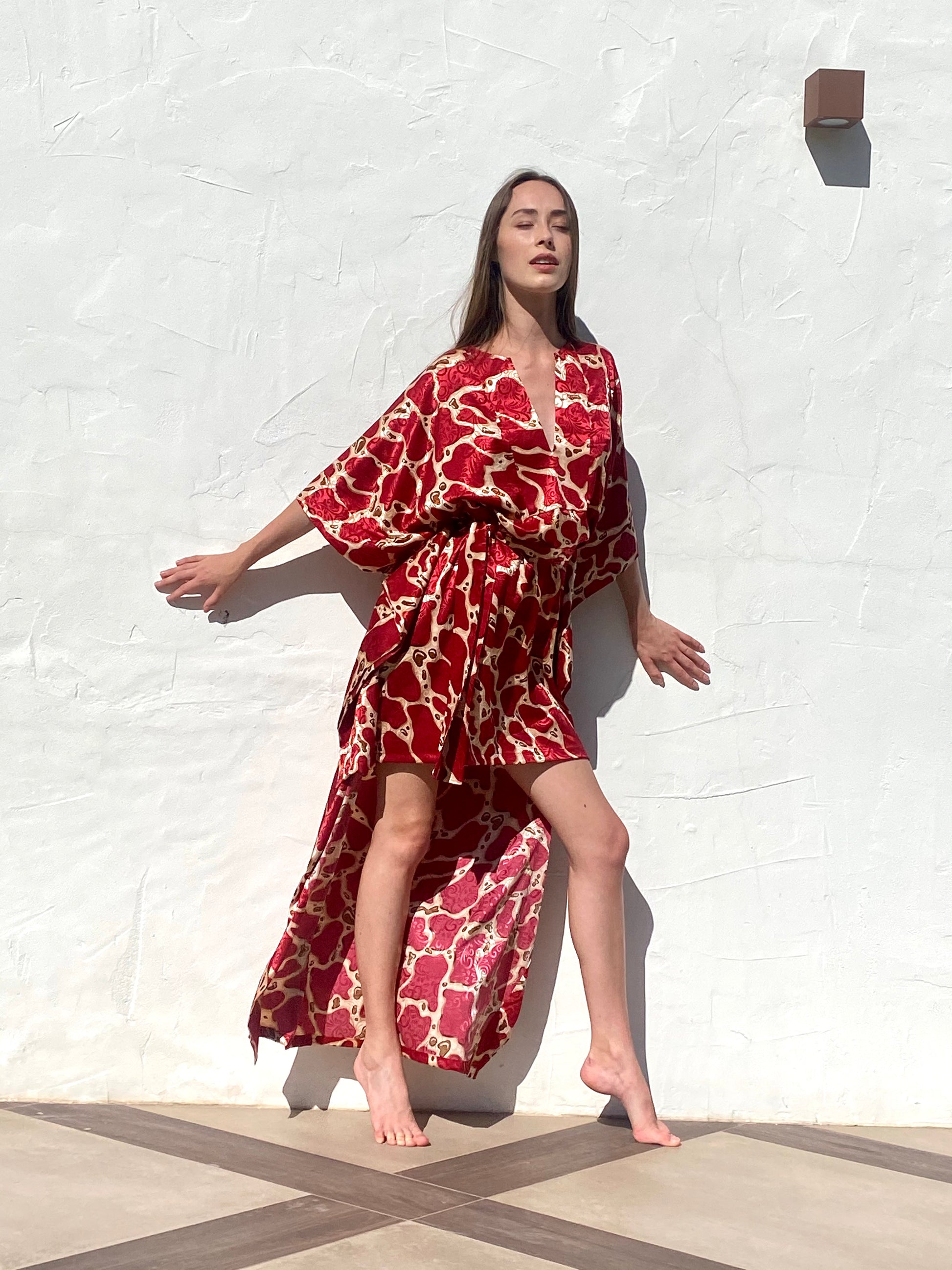 The Annie Olympia Kaftan by From-Angie is made in jequard fabric. The red Olympia Kaftan is the perfect piece for any occasion, short in the front and longer at the back, belted and in timeless print.