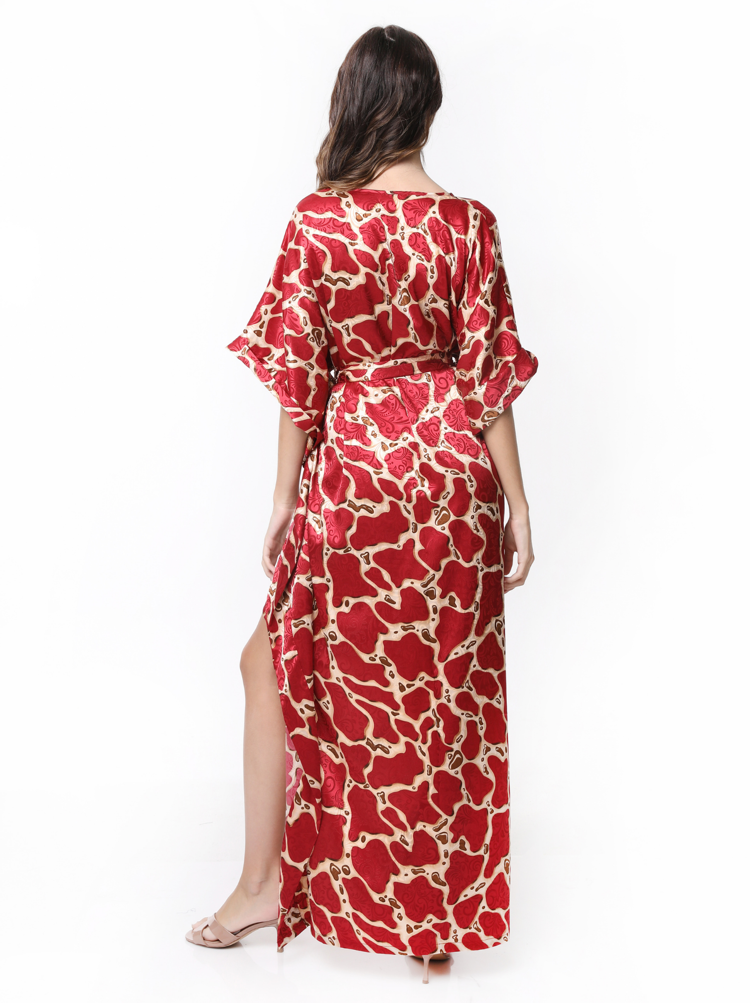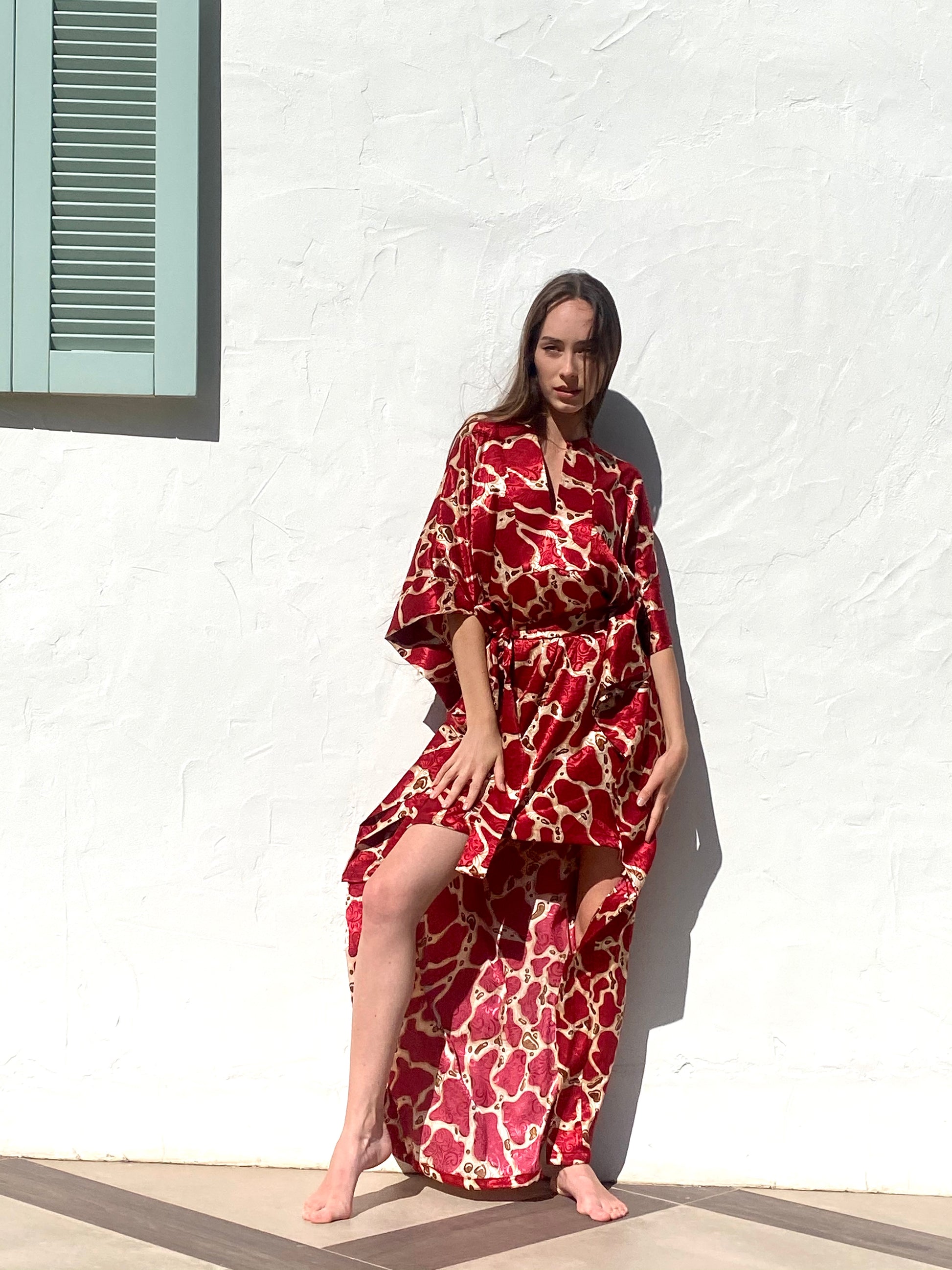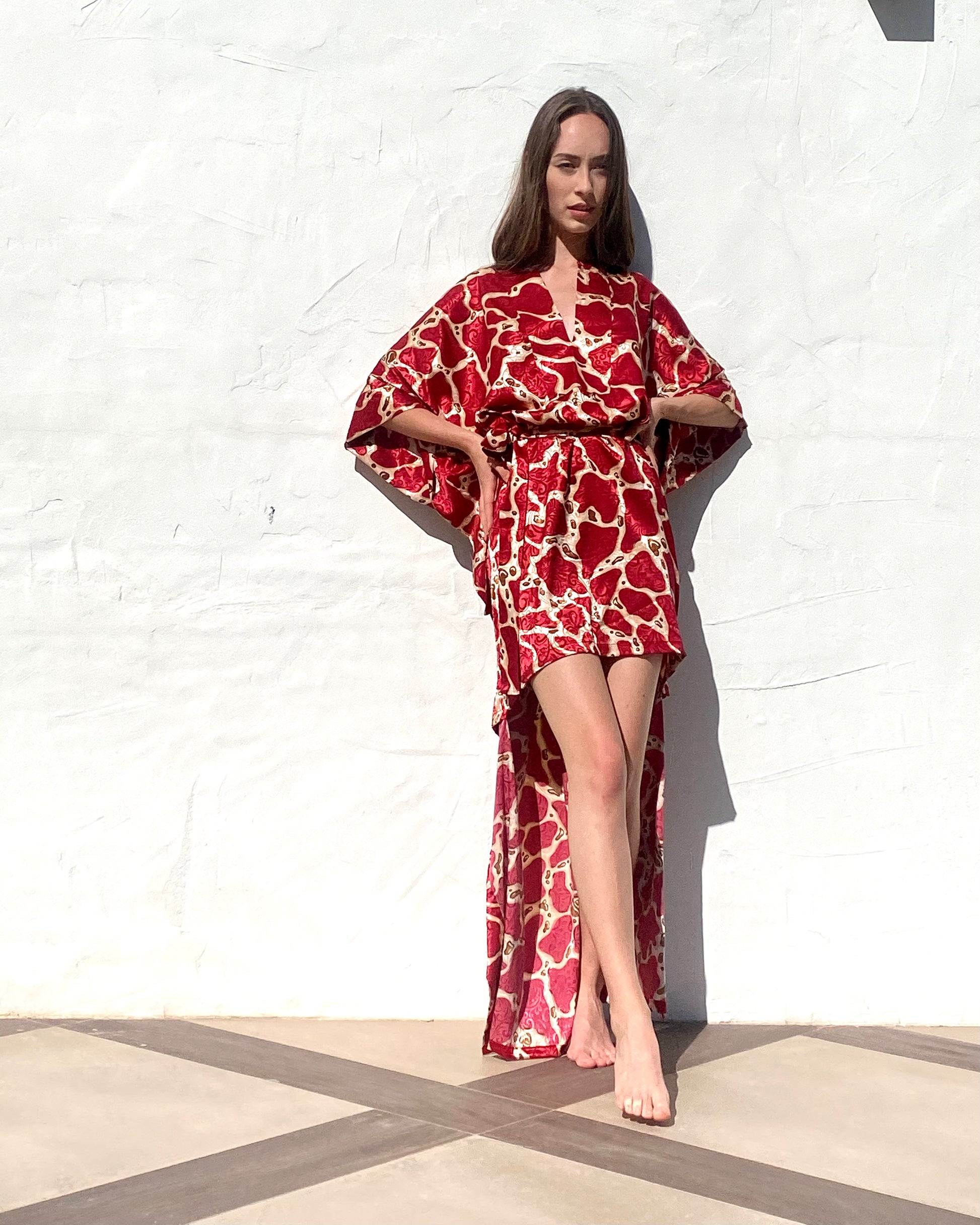 The Annie Olympia Kaftan by From-Angie is made in jequard fabric. The red Olympia Kaftan is the perfect piece for any occasion, short in the front and longer at the back, belted and in timeless print.