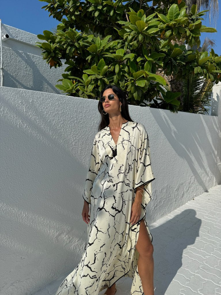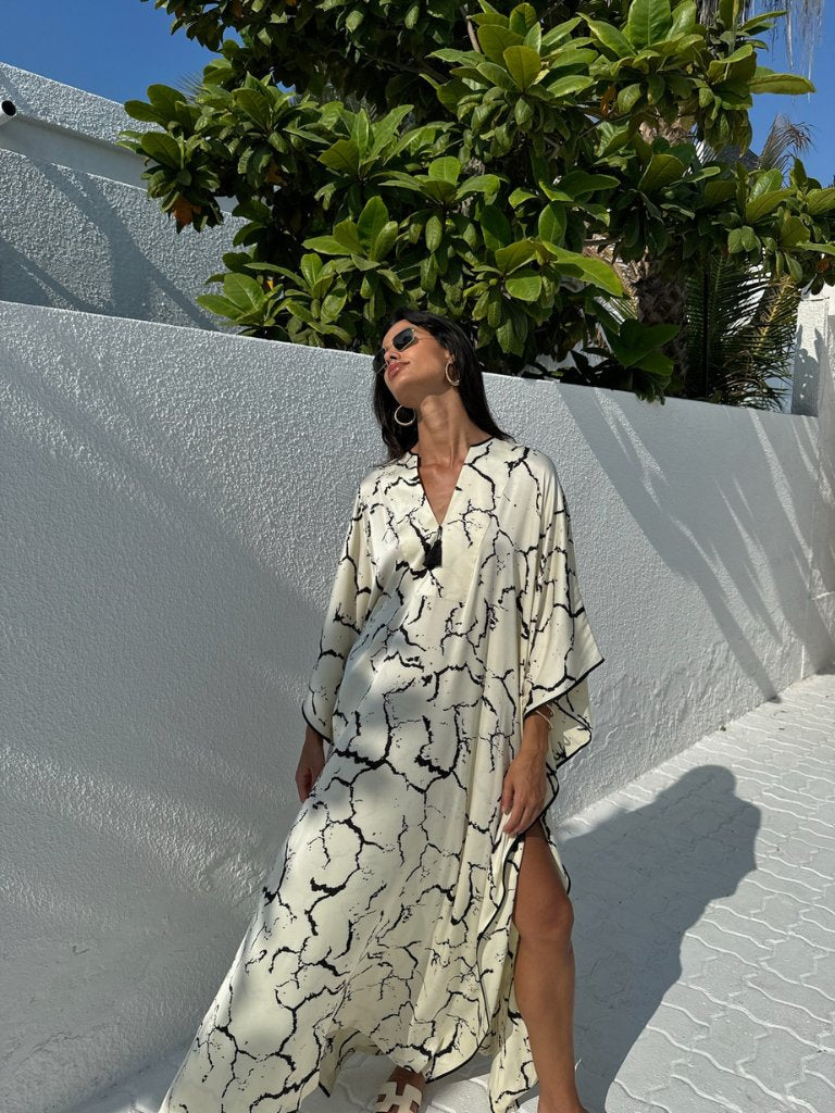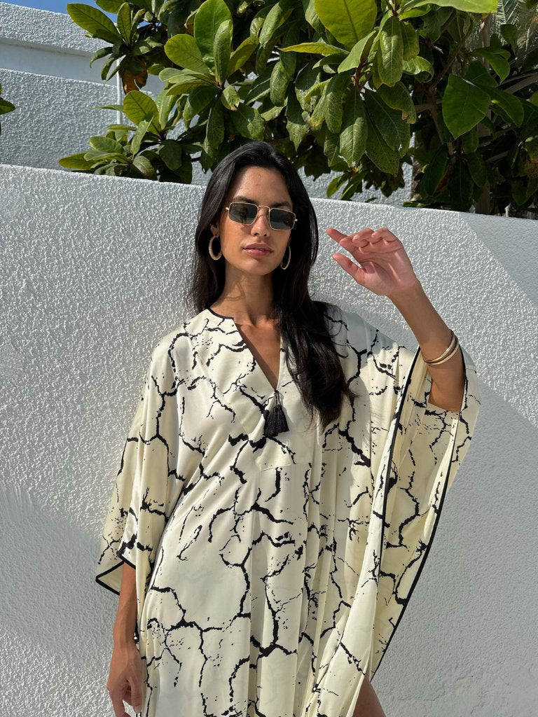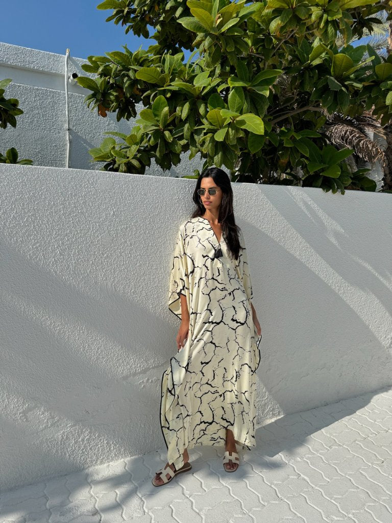 Our Classics, feminine and flowy, this forever timeless kaftan in this elegant printed silk, is a must have in all modest-wear collections. Exquisite cream color with a V-neckline holding our signature black tassels giving a perfect look.