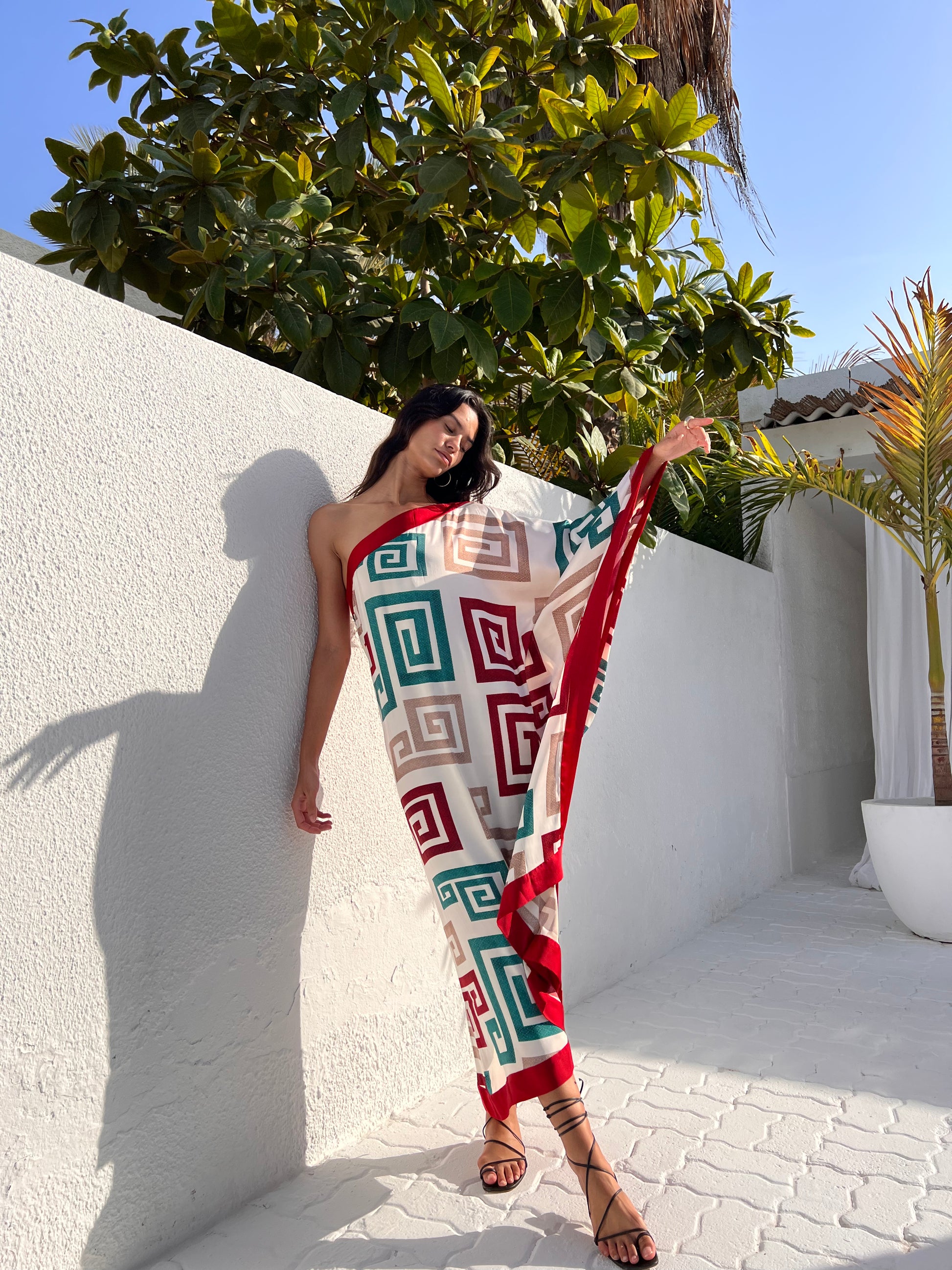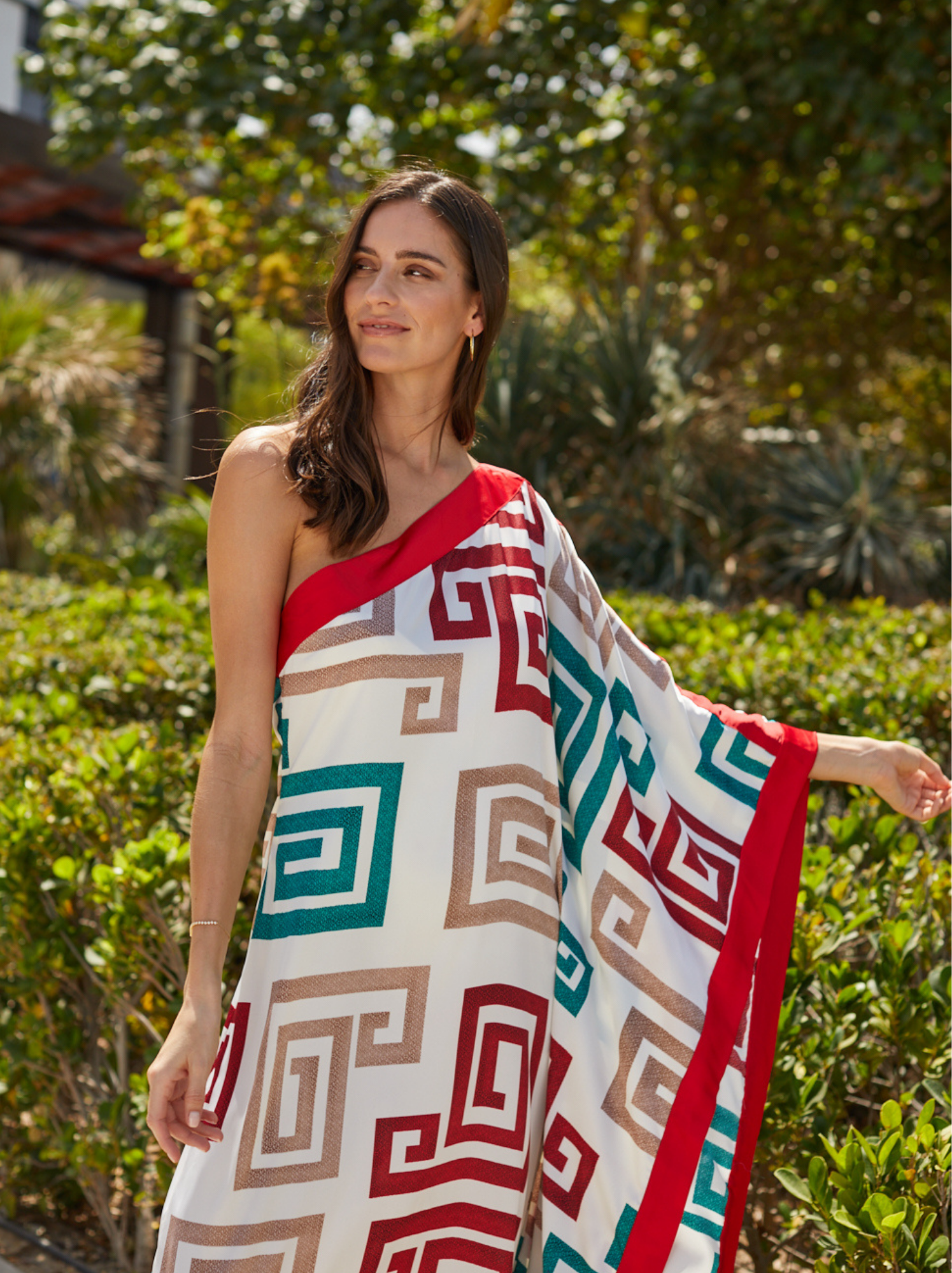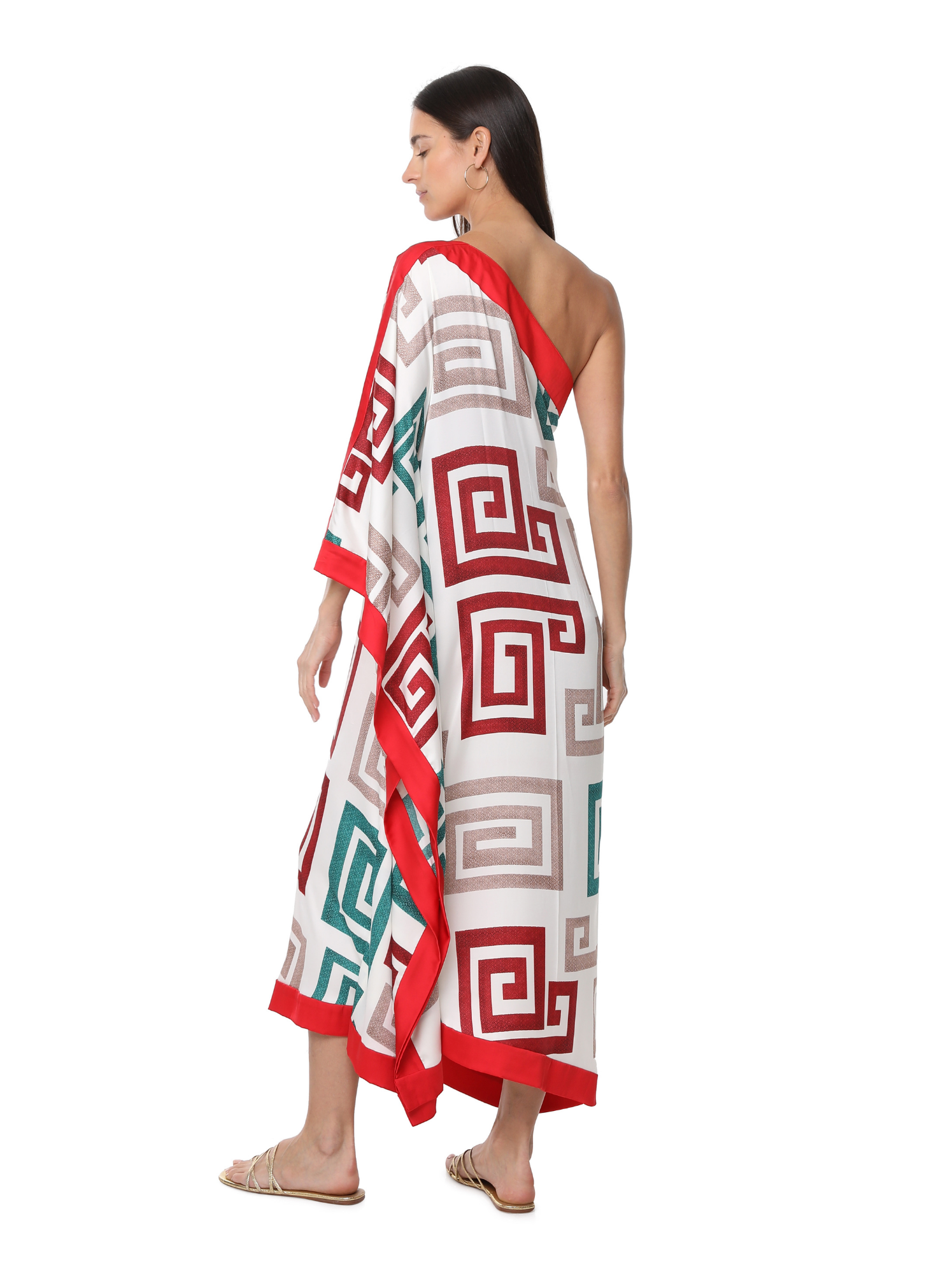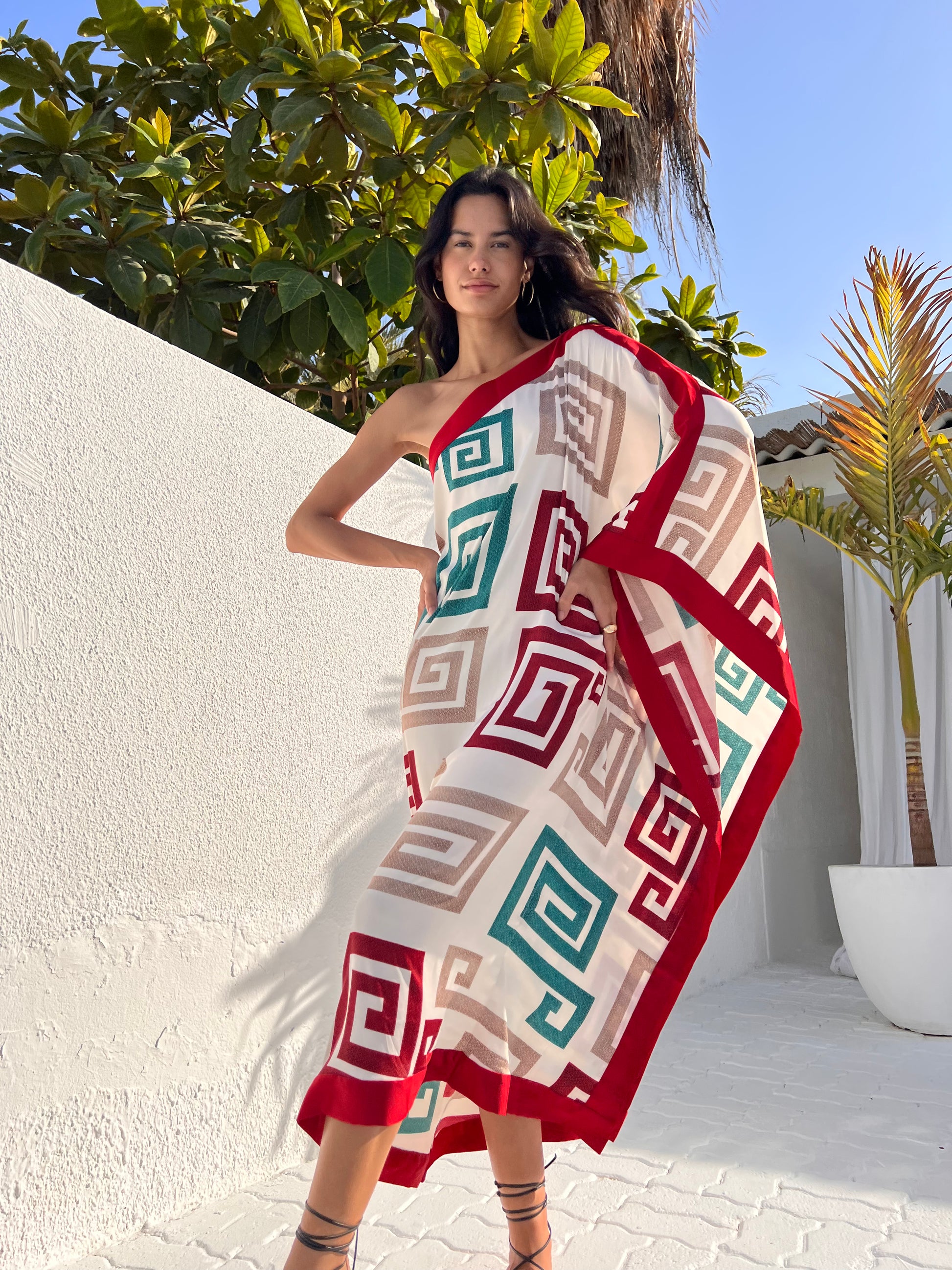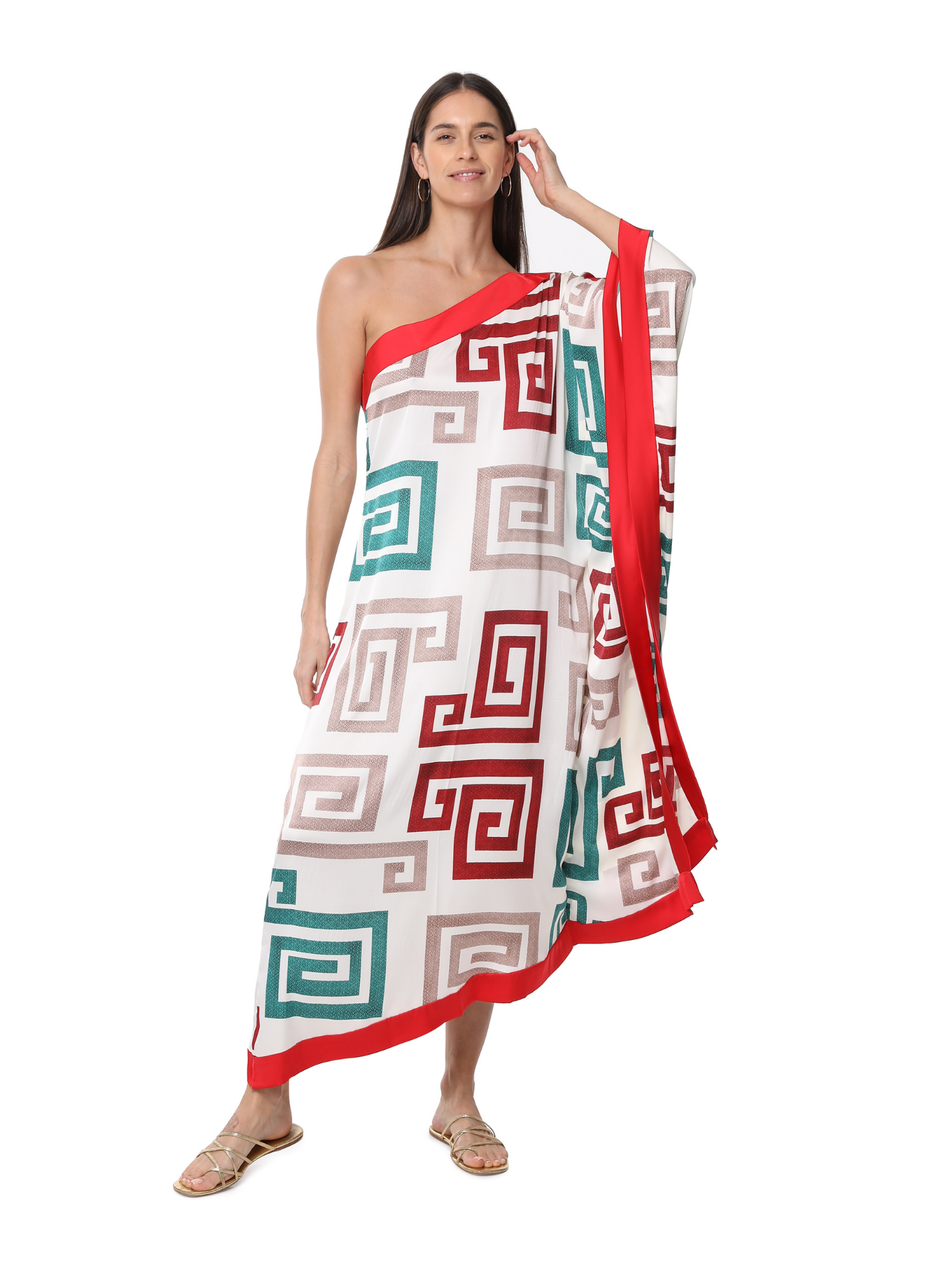 Elena One Shoulder dress in this elegant printed silk design mixed with plain red satin!