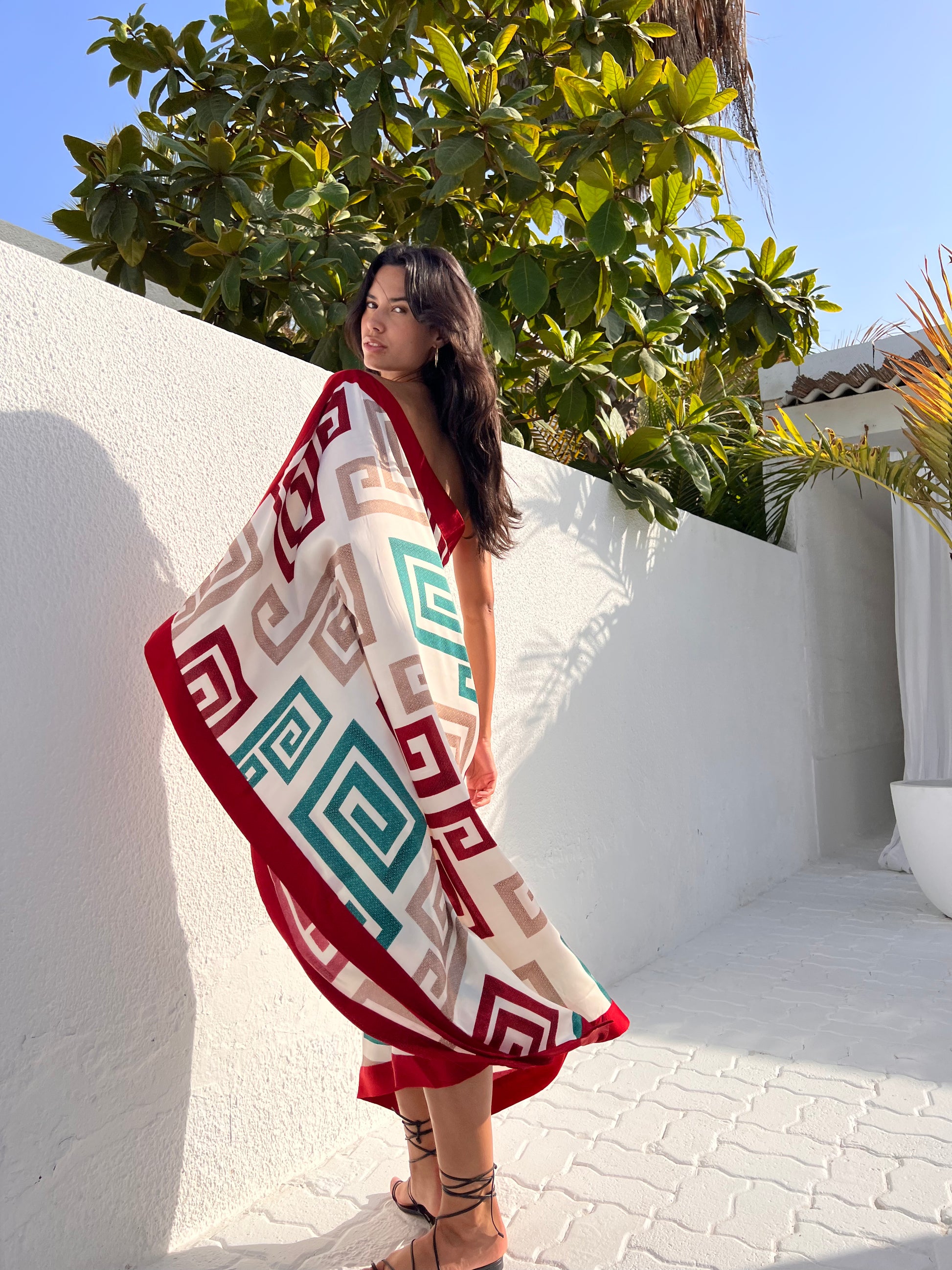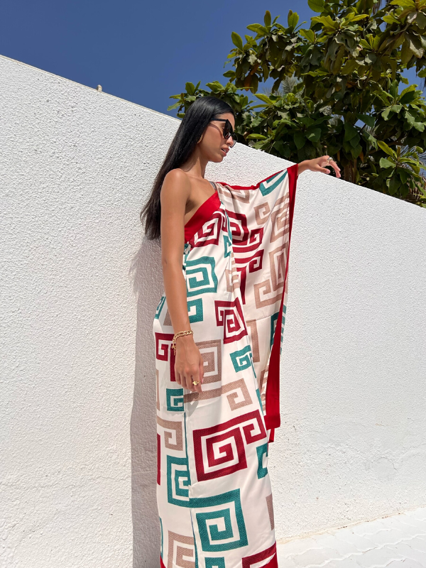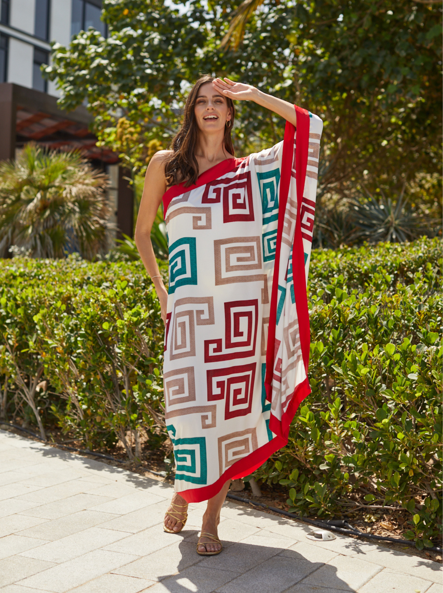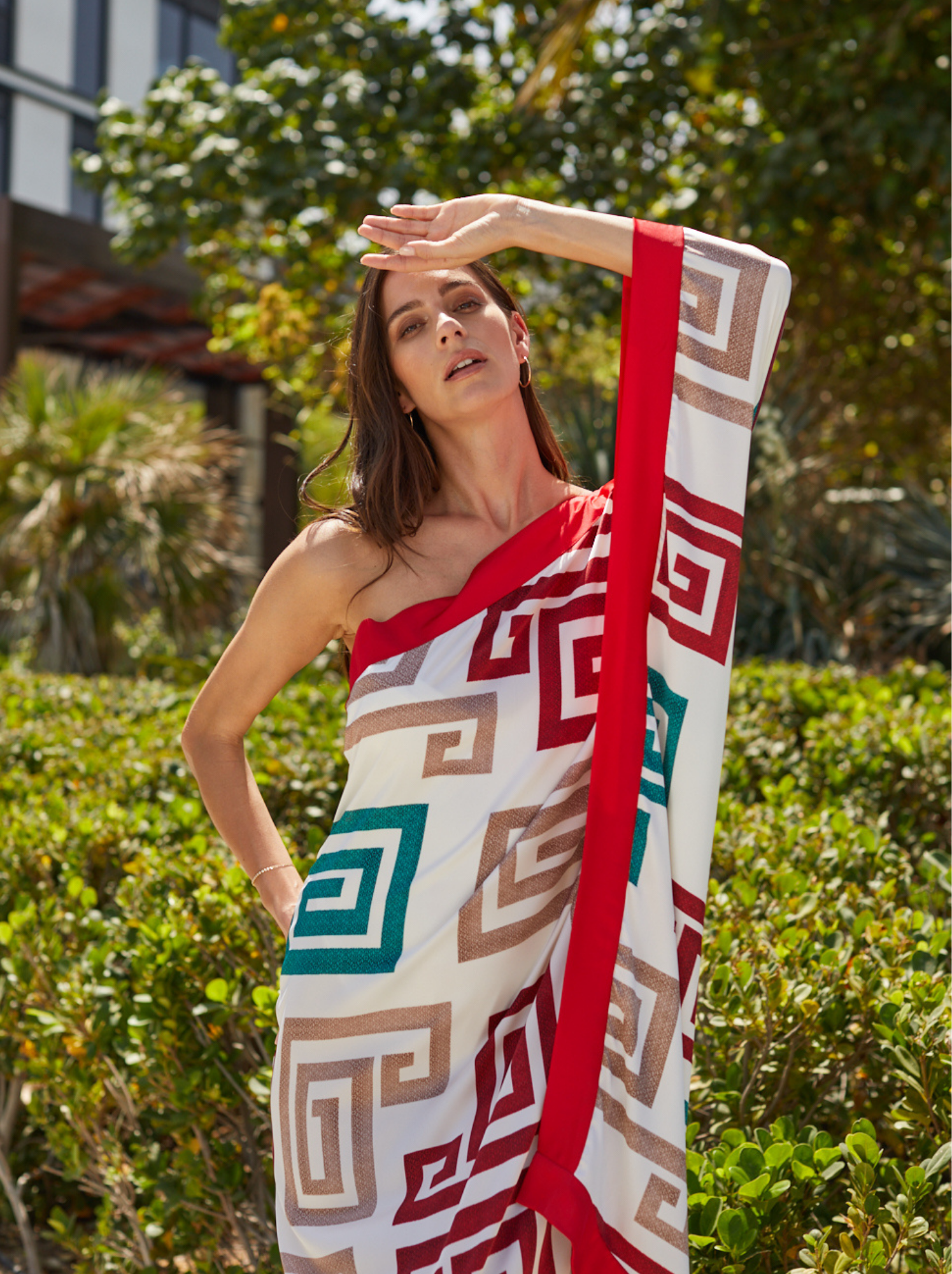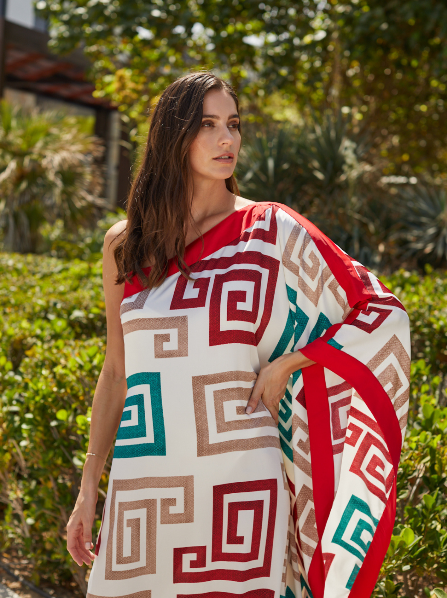 Elena One Shoulder dress in this elegant printed silk design mixed with plain red satin!