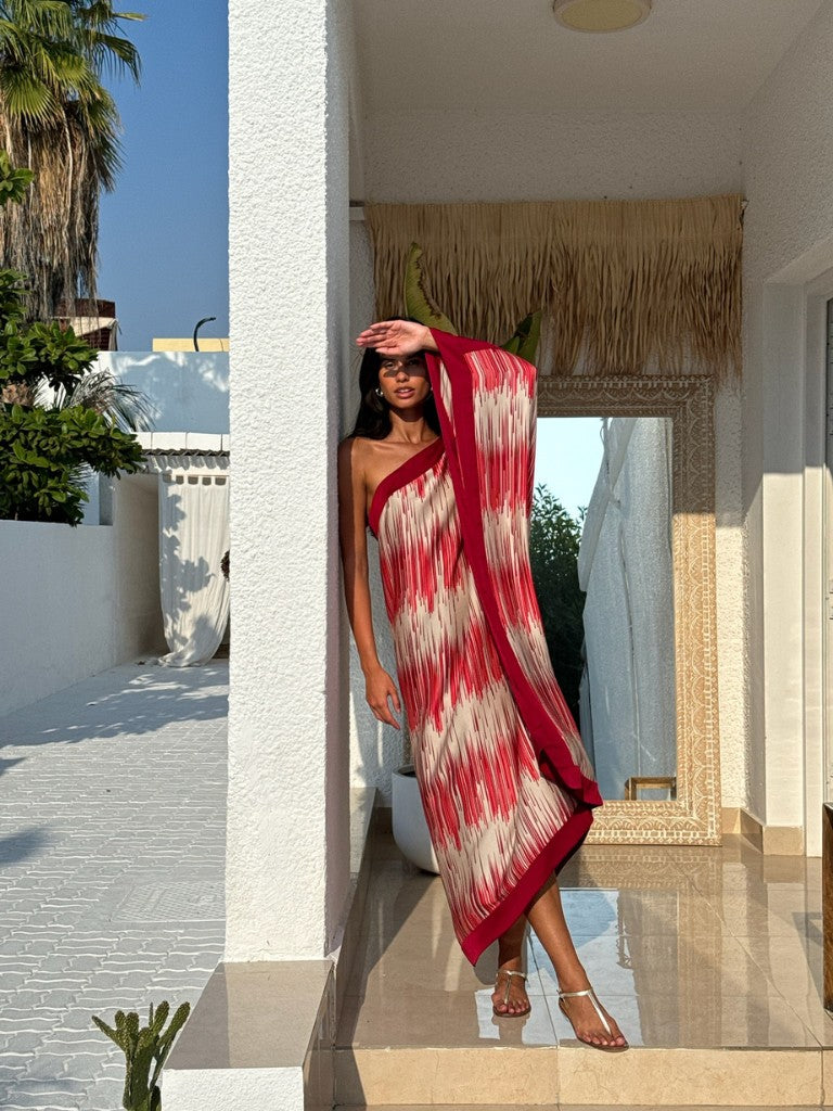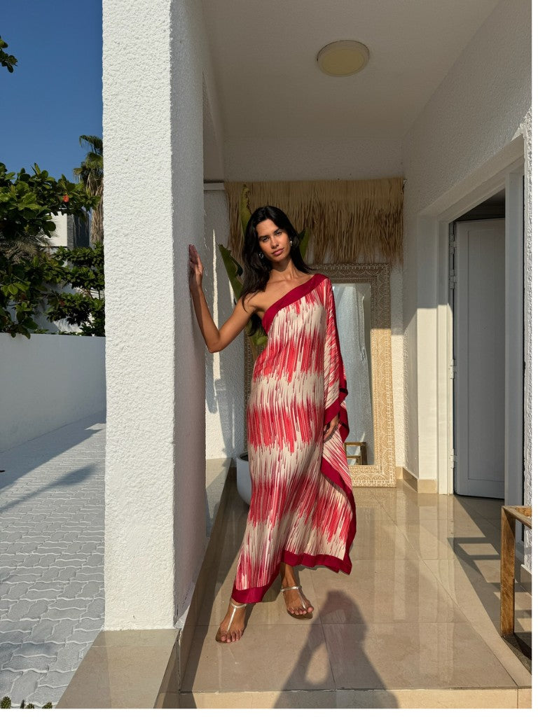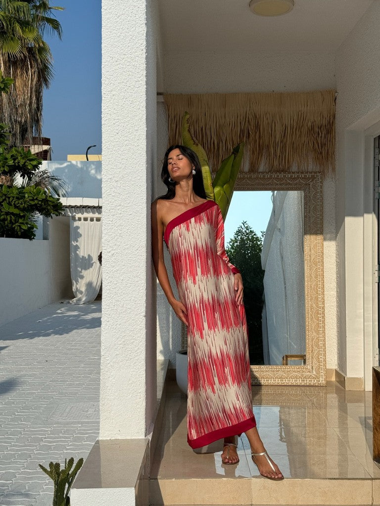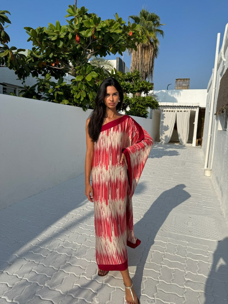 Elena One Shoulder dress in this elegant red & cream silk design !