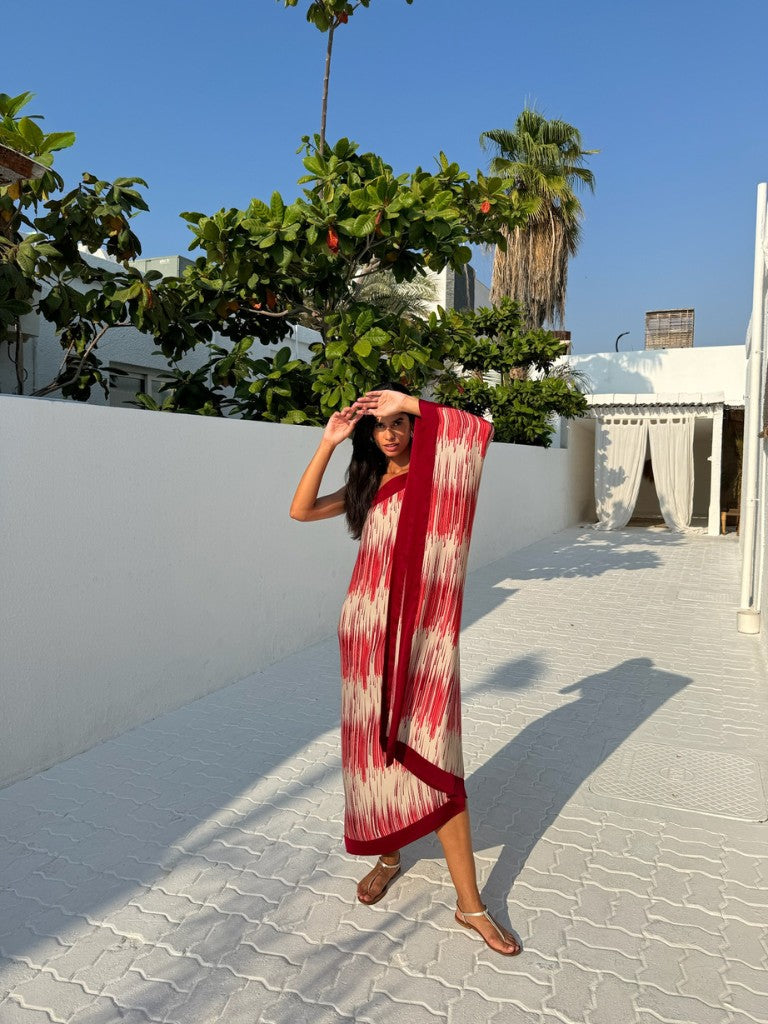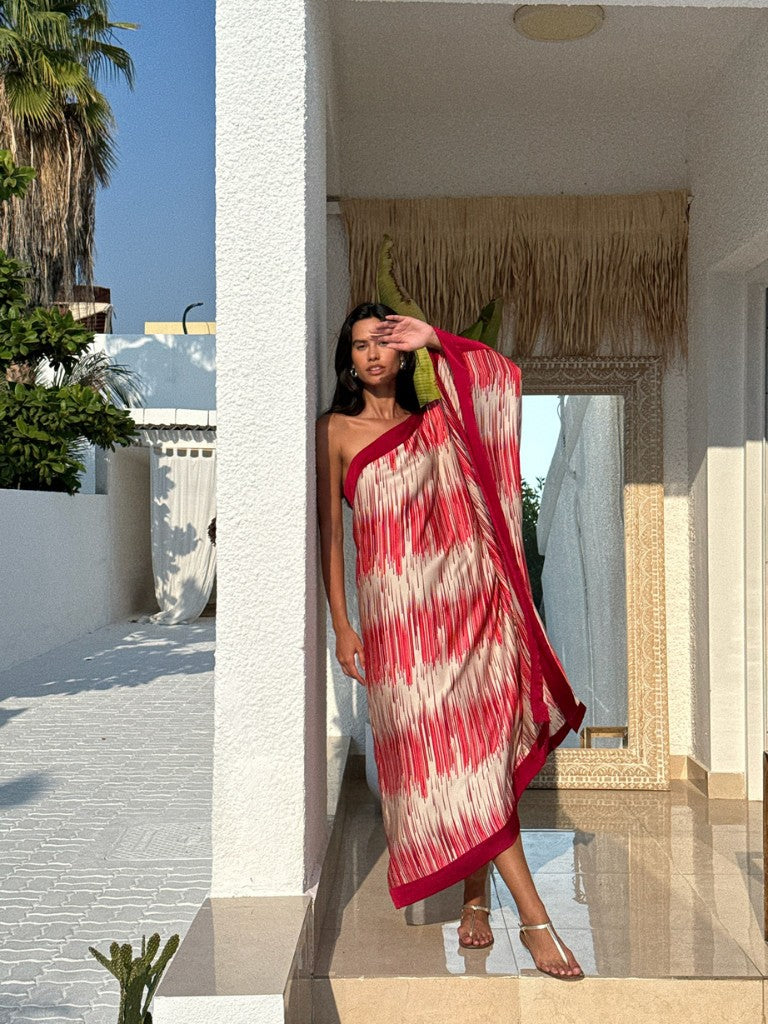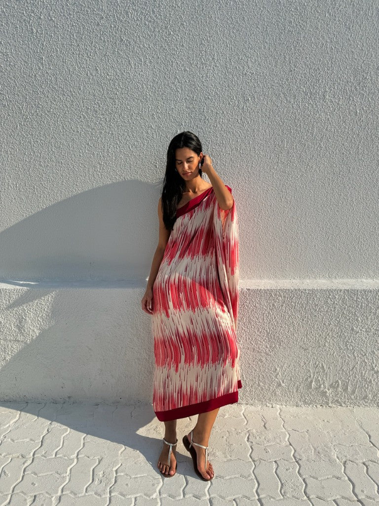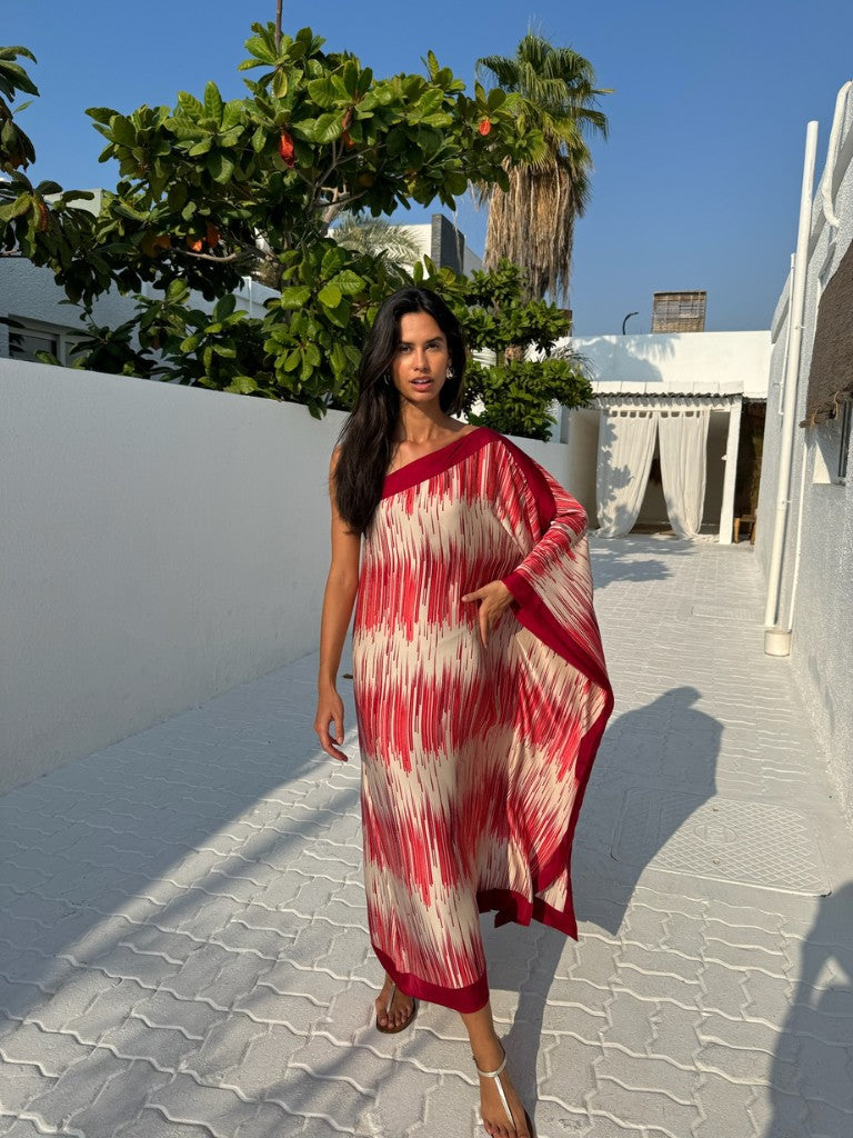 Elena One Shoulder dress in this elegant red & cream silk design !