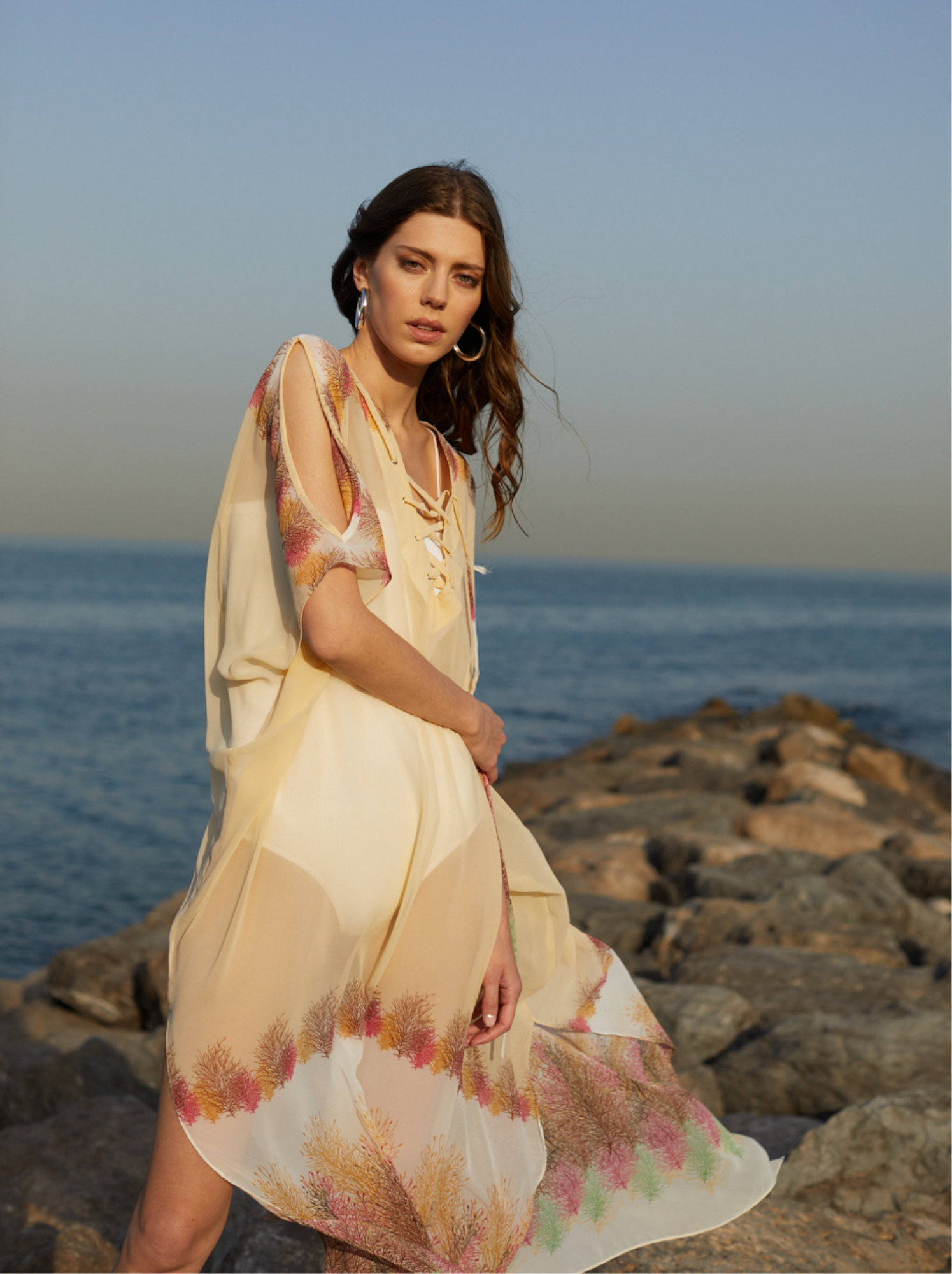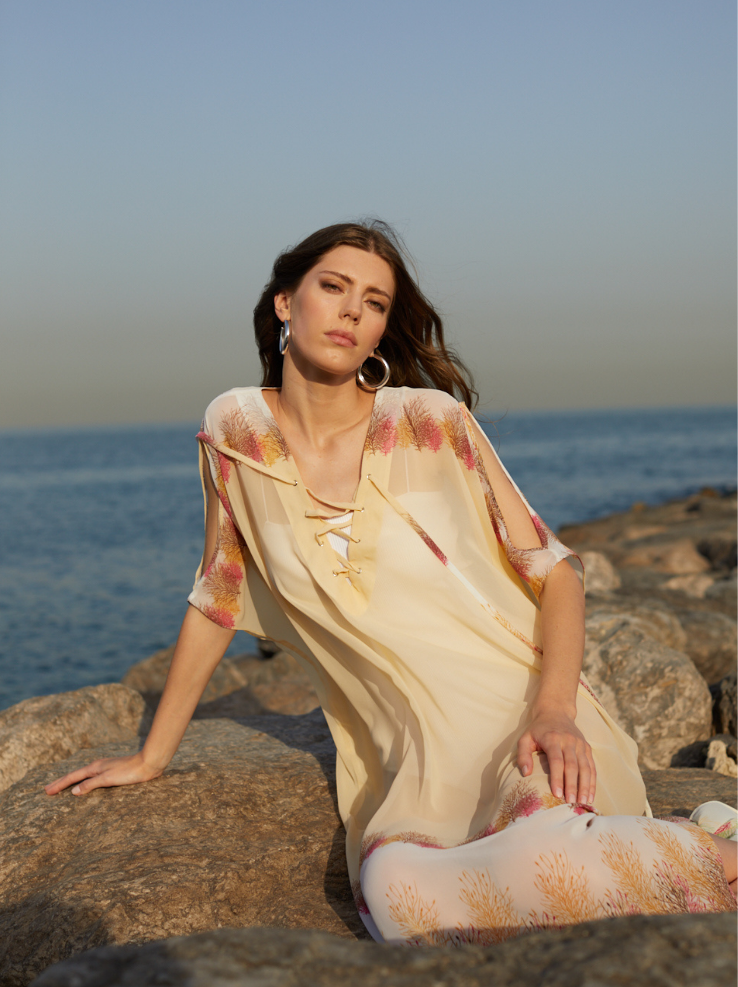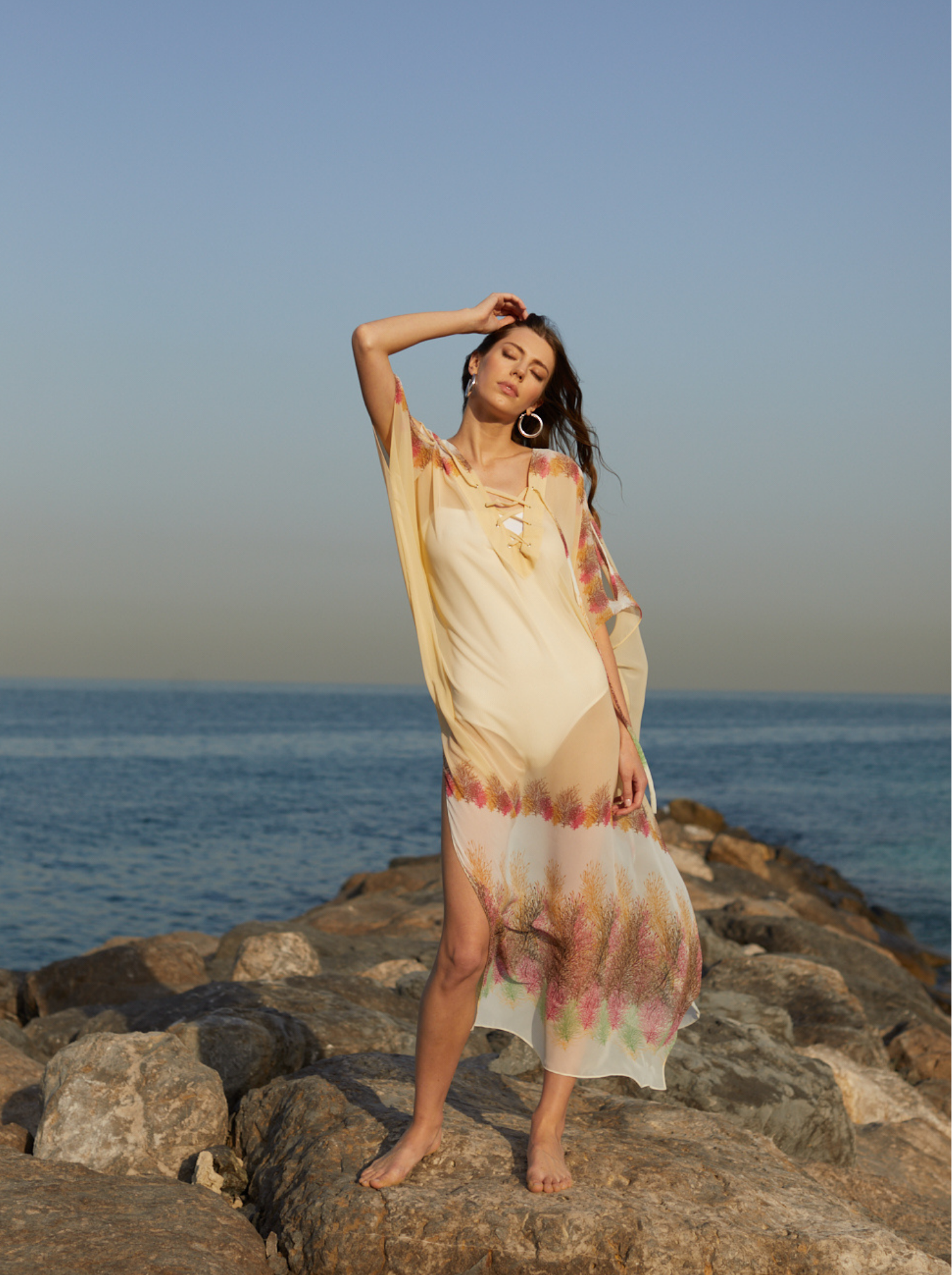The Ella Kaftan in this beautiful printed chiffon in soft yellow with printed shoulders and bottom part.