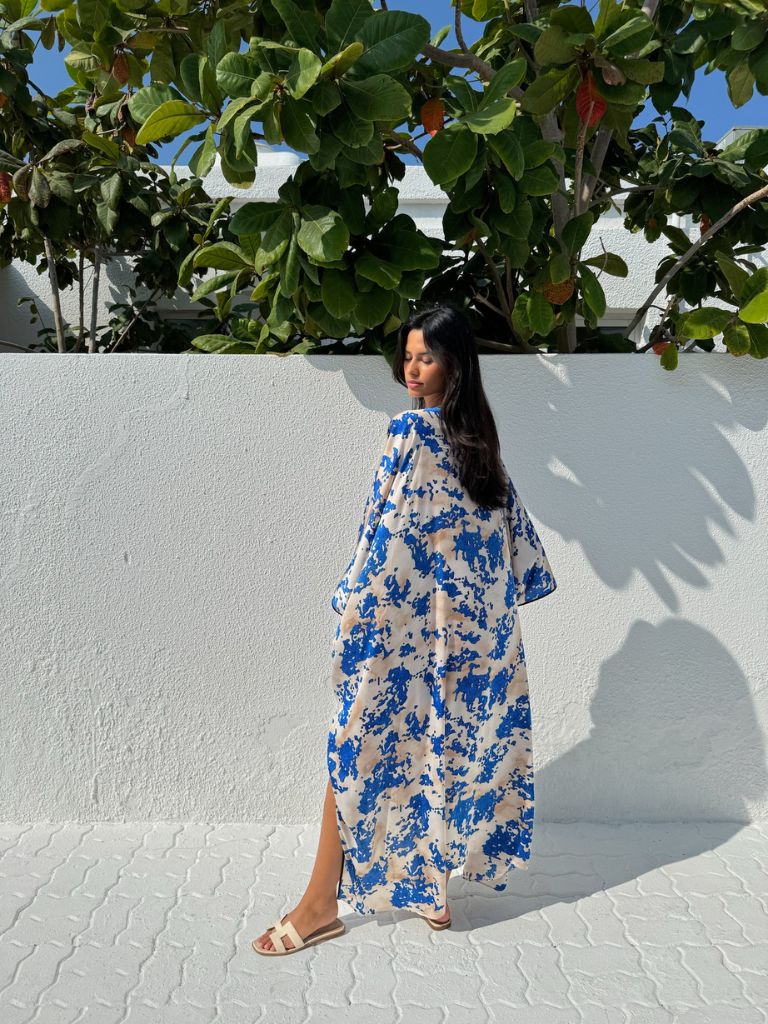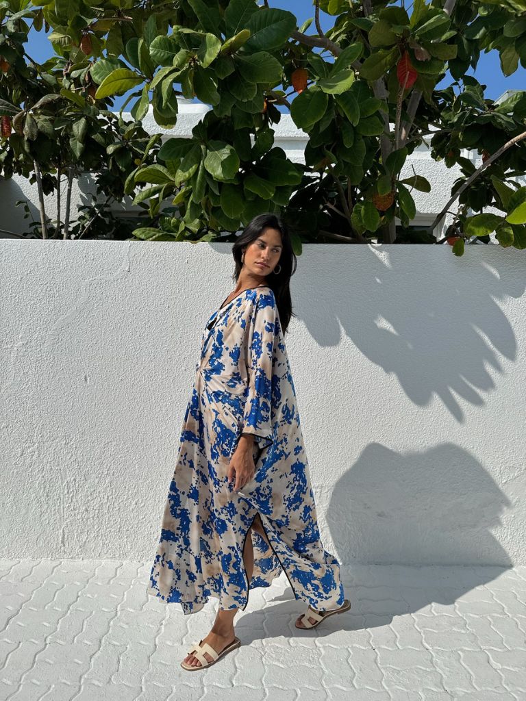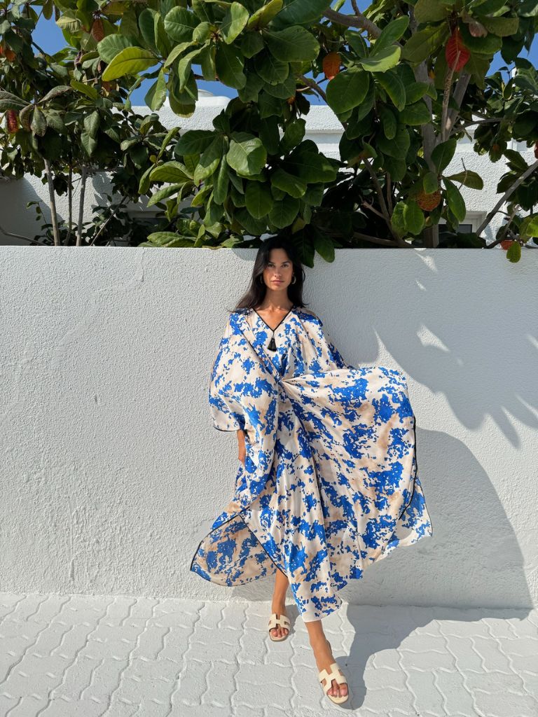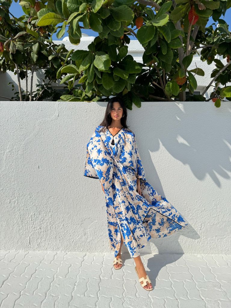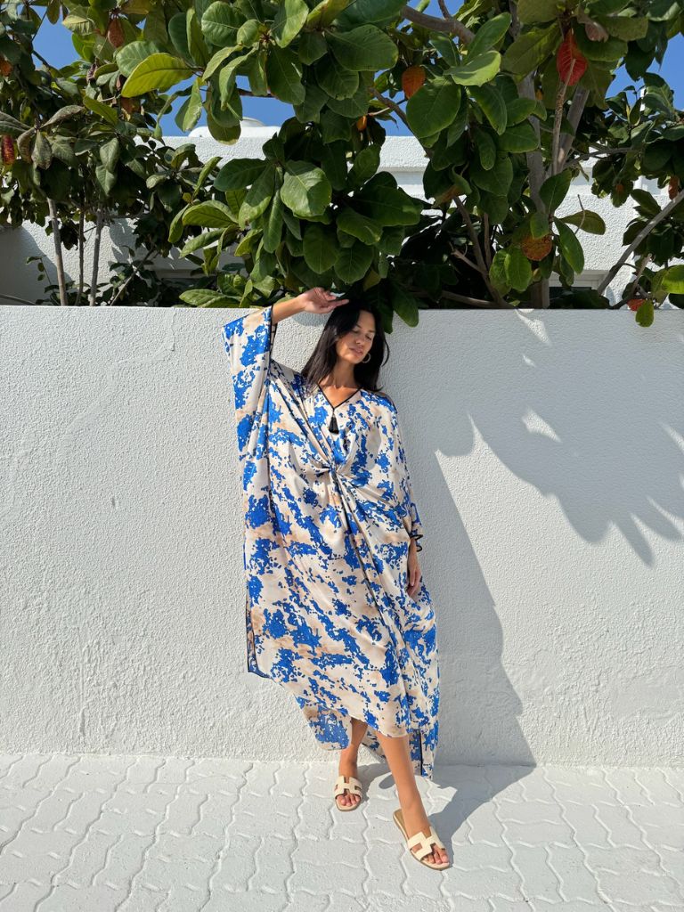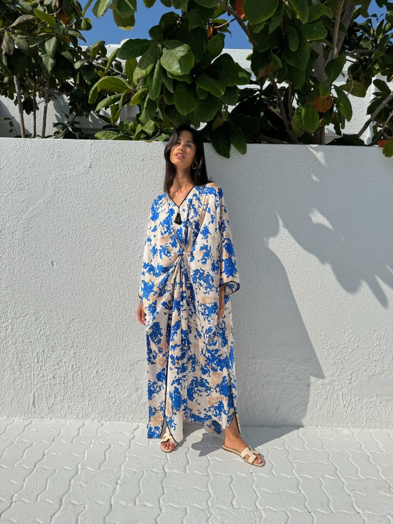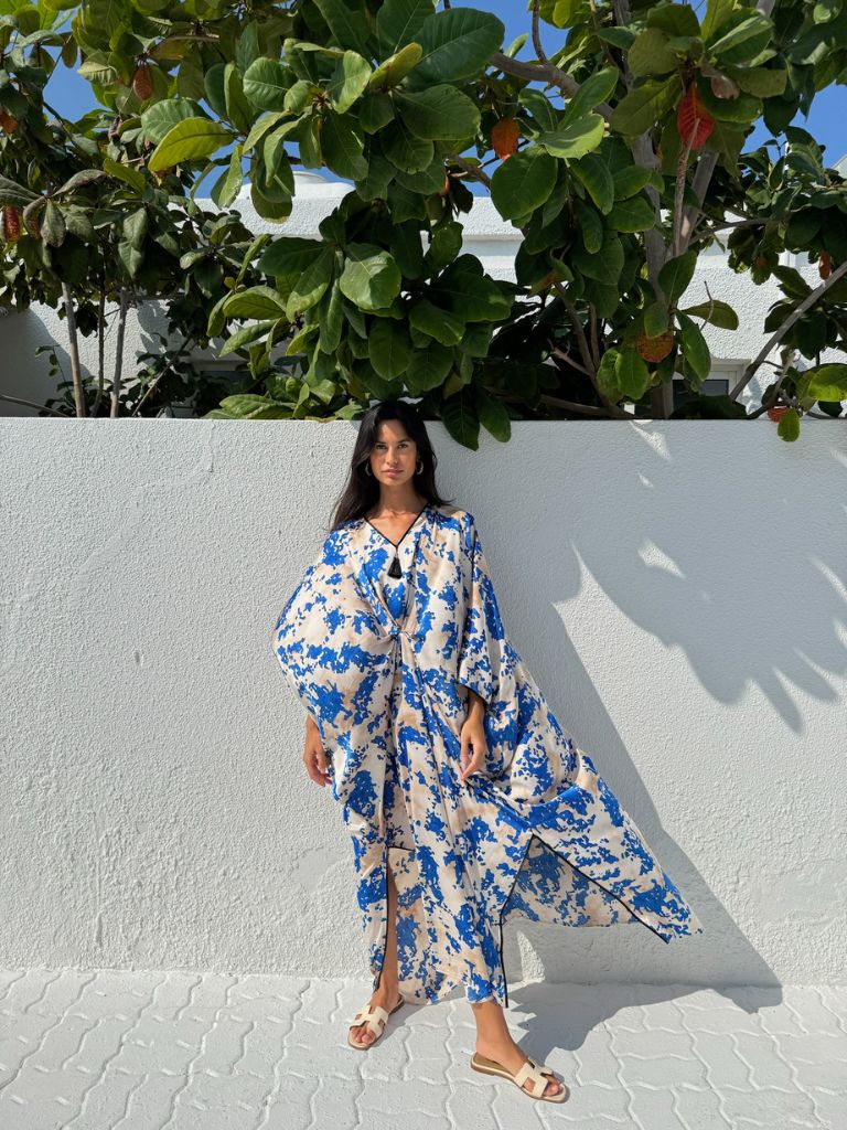 The Hannah kaftan is a wonderful soft silk design in an elegant but colorful print with a deep V-neckline holding 2 tassels, just perfect to look fresh and feel comfortable on your vacation days.