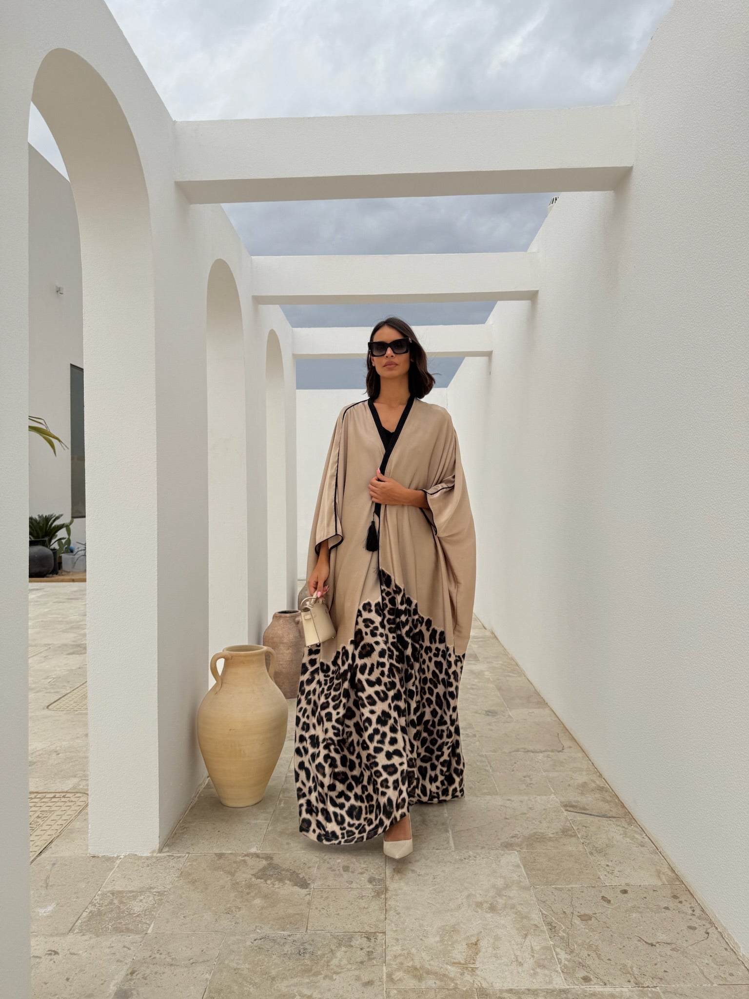 The Mimi Silk Tunic will elevate your modest-wear collection with this beautiful leopard printed silk. Crafted from a silk fabric, cut for an exceptional fluid movement and tasseled with handmade trims on the lapel all the way down along the front.