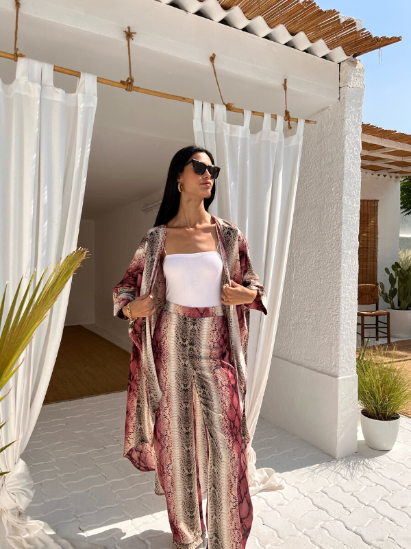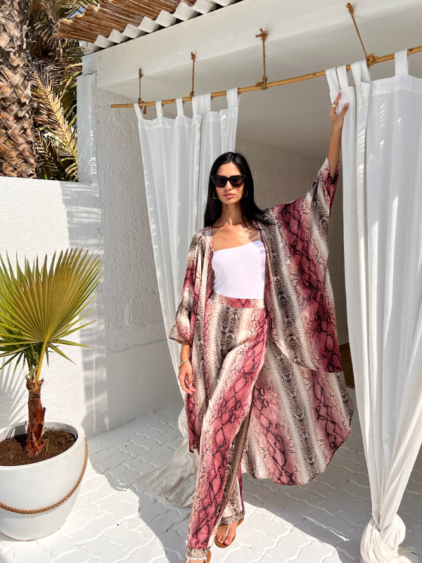 This twin set in snake rose print is the combination of a kaftan-robe with trousers with an open slit on each side. Waist is elastic and fits all sizes.