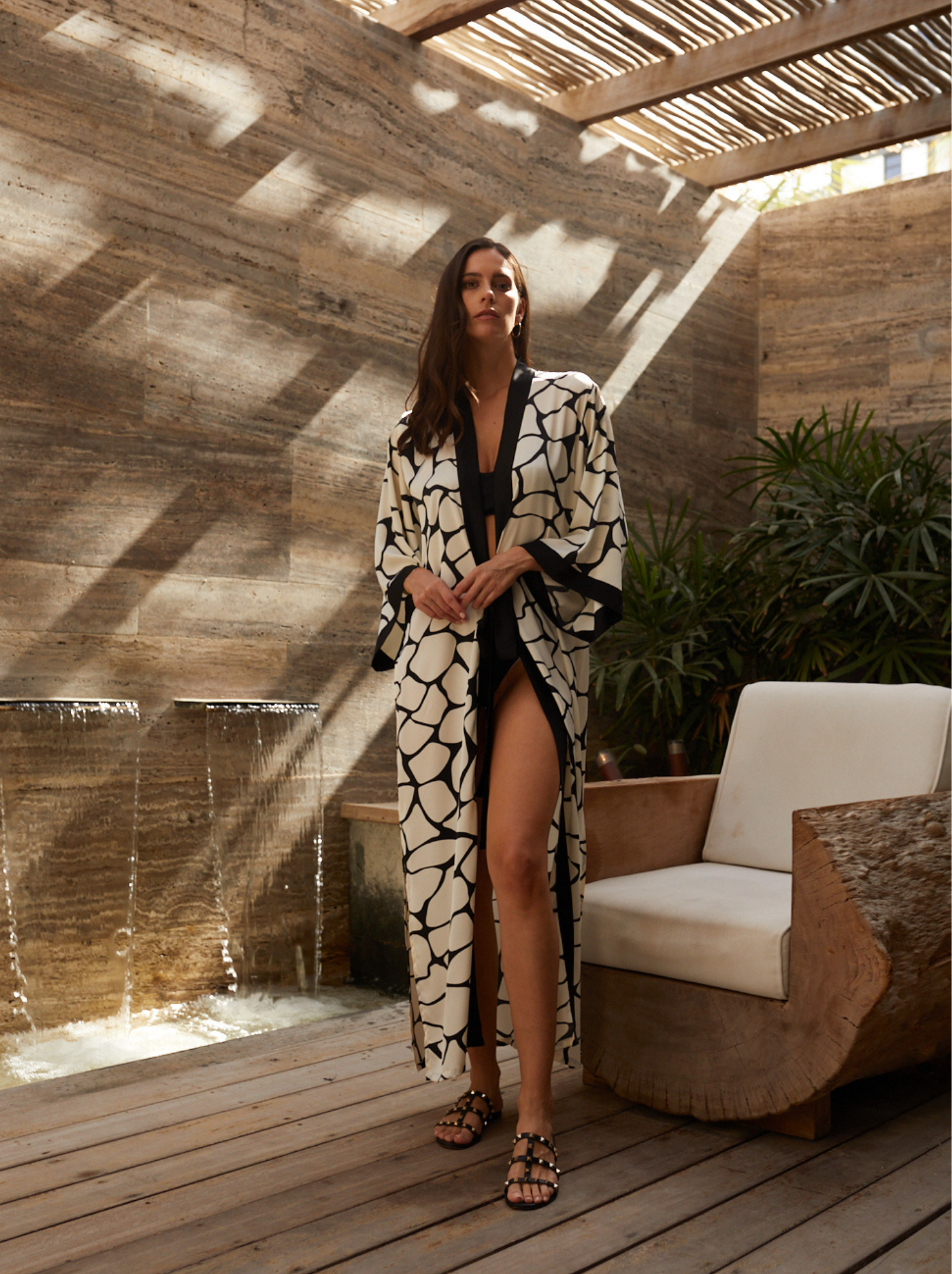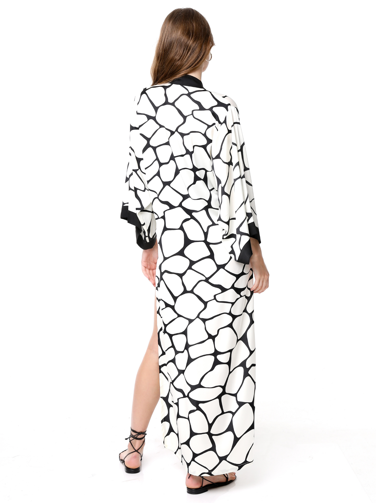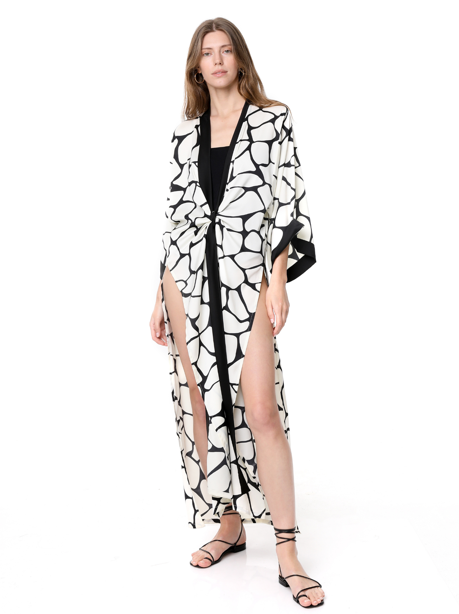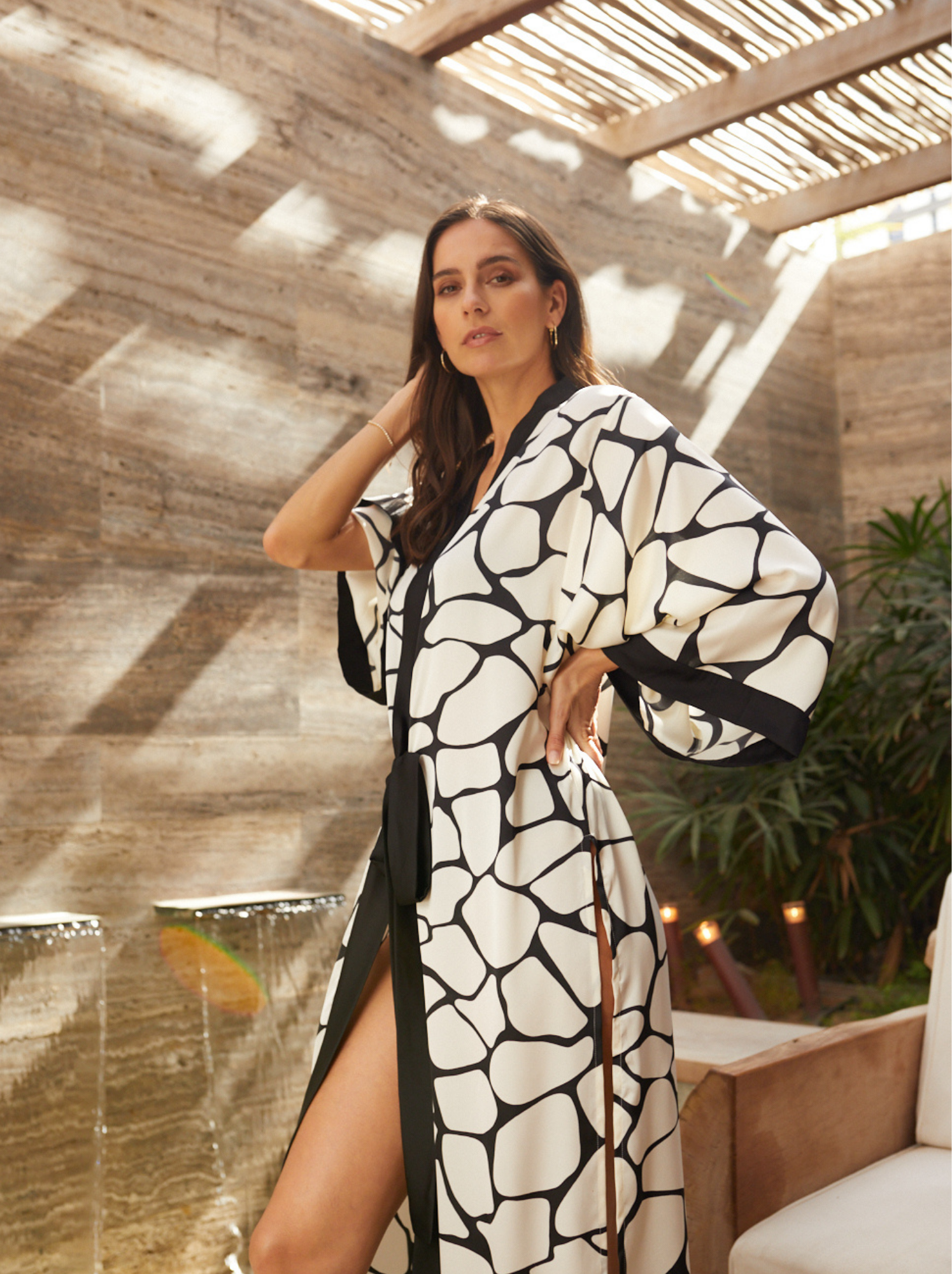 The Sara Kimono design is the perfect robe, feminine and practical. Printed Silk in beautiful animal giraffe print, open on the sides and with a belt in the front to adjust it to your shape or keep it lose.
