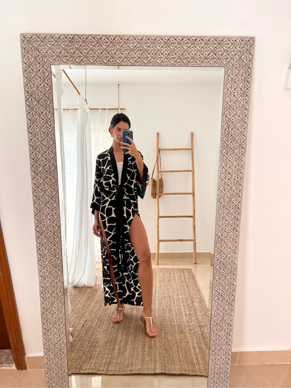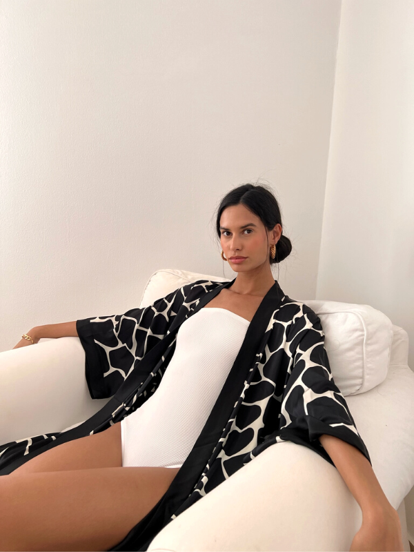 The Sara Kimono design is the perfect robe, feminine and practical. Printed Silk in beautiful animal giraffe print, open on the sides and with a belt in the front to adjust it to your shape or keep it lose.
