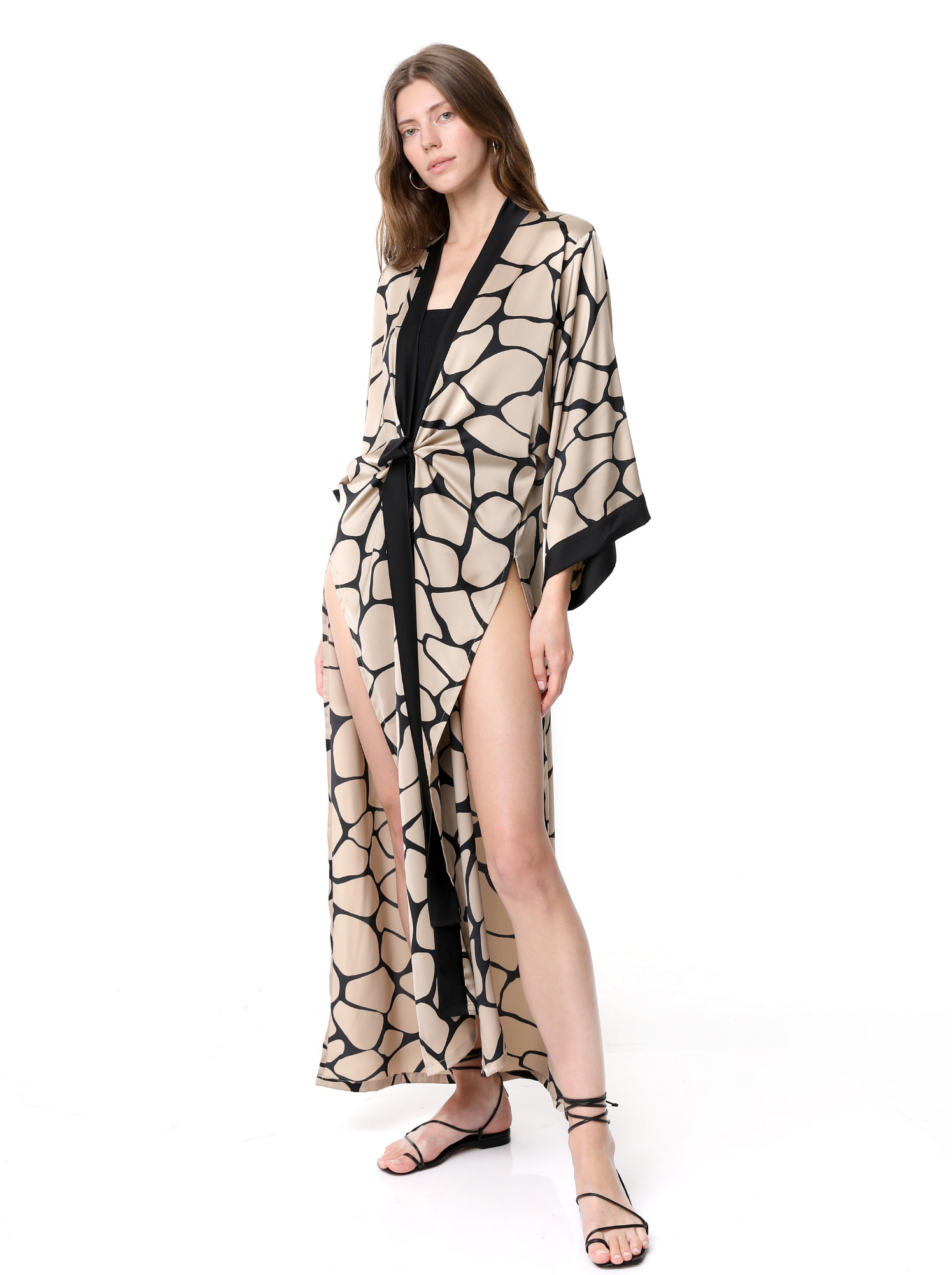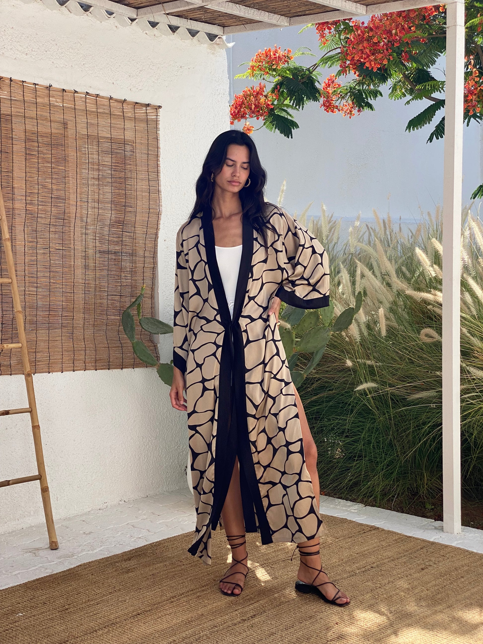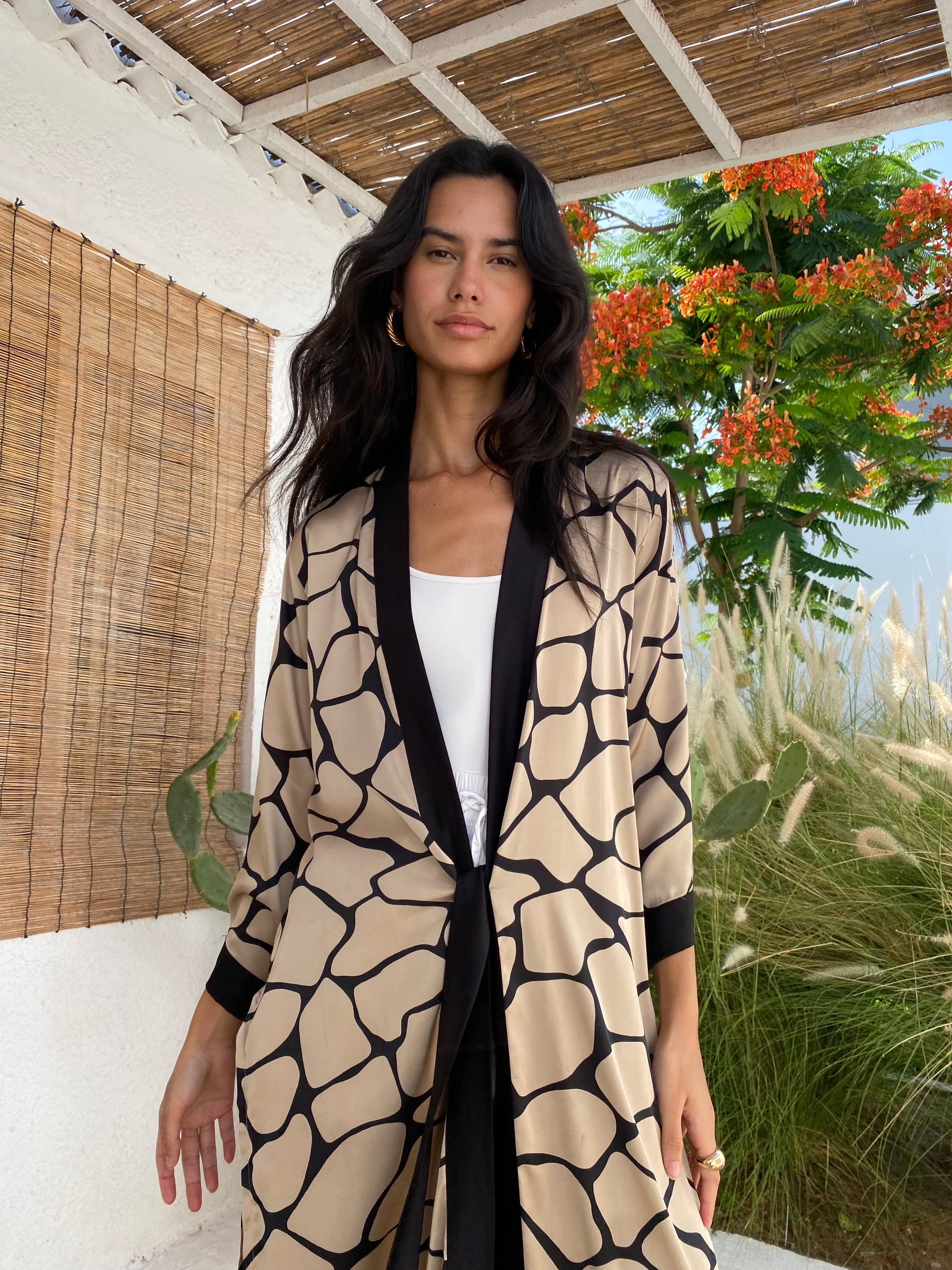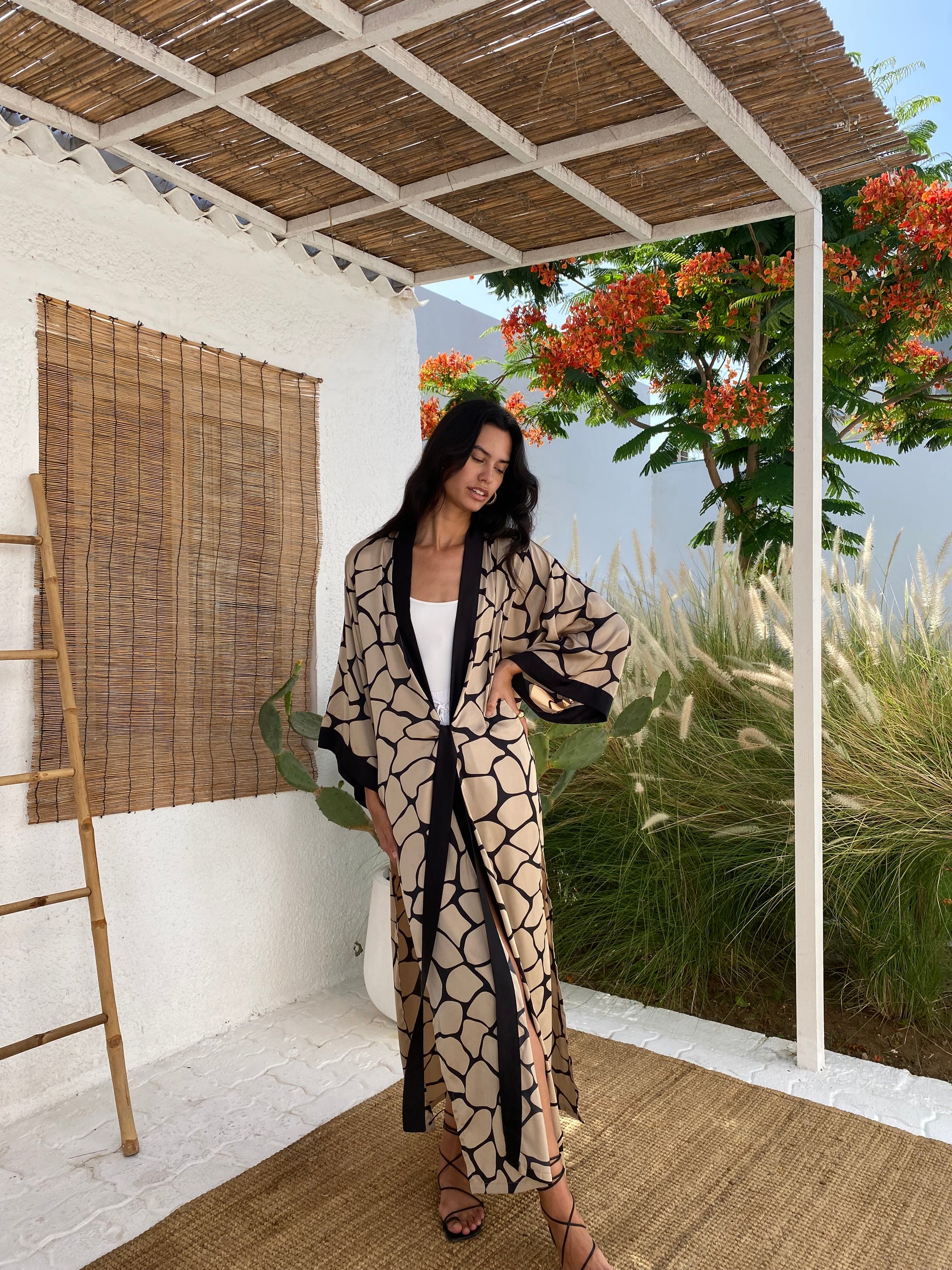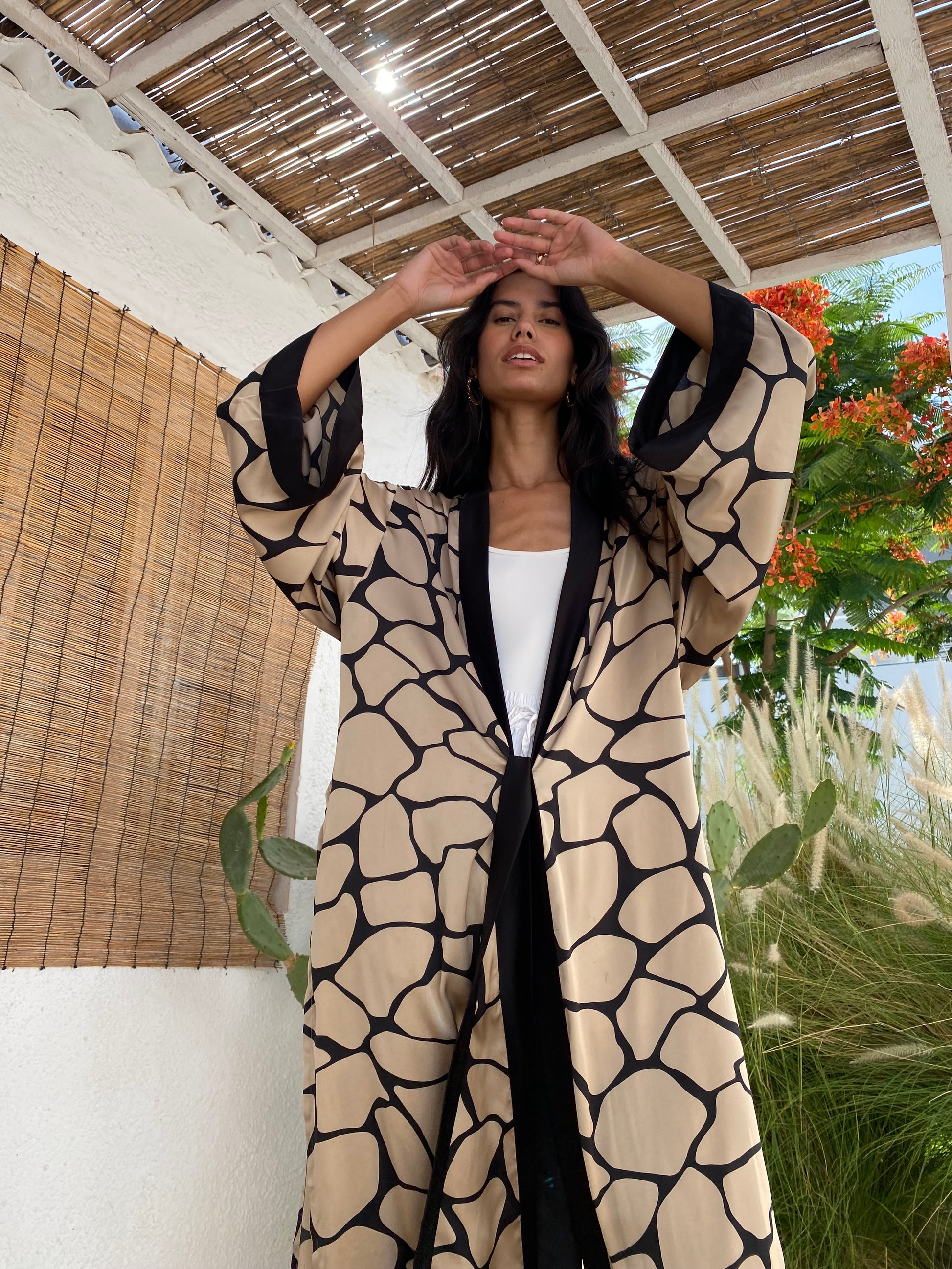 The Sara Kimono design is the perfect robe, feminine and practical. Printed Silk in beautiful animal giraffe print, open on the sides and with a belt in the front to adjust it to your shape or keep it lose.
