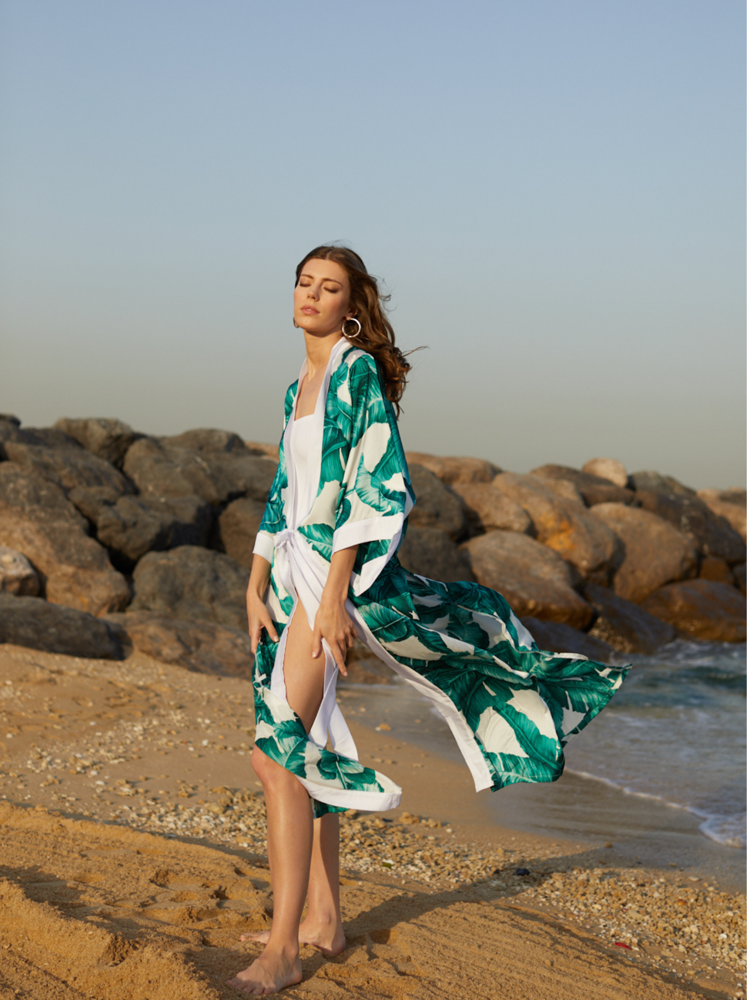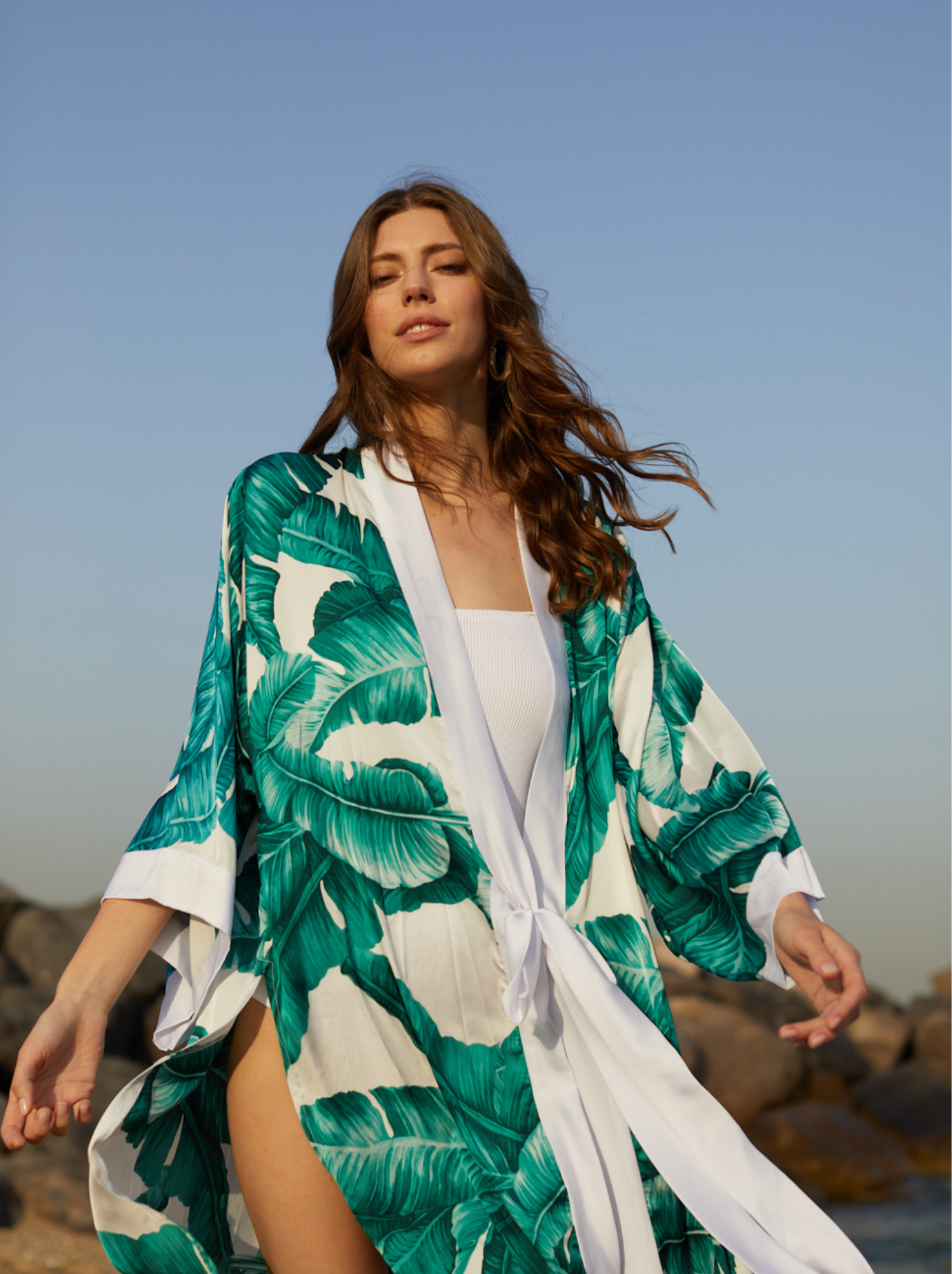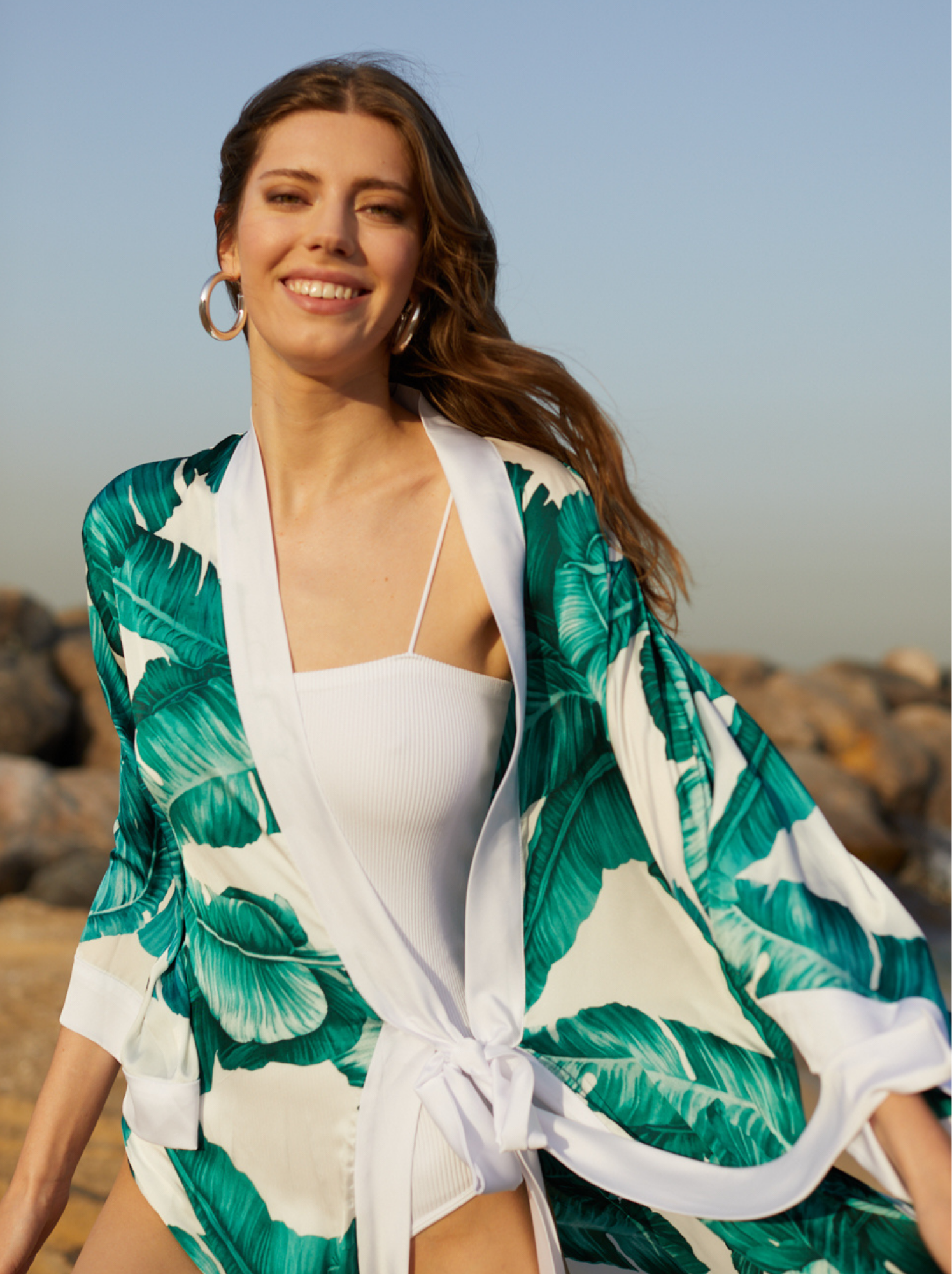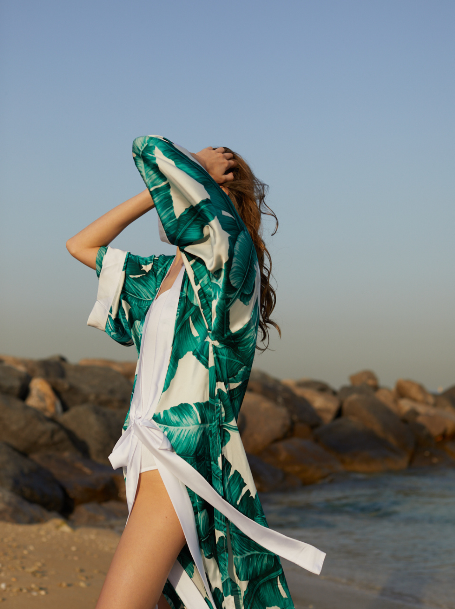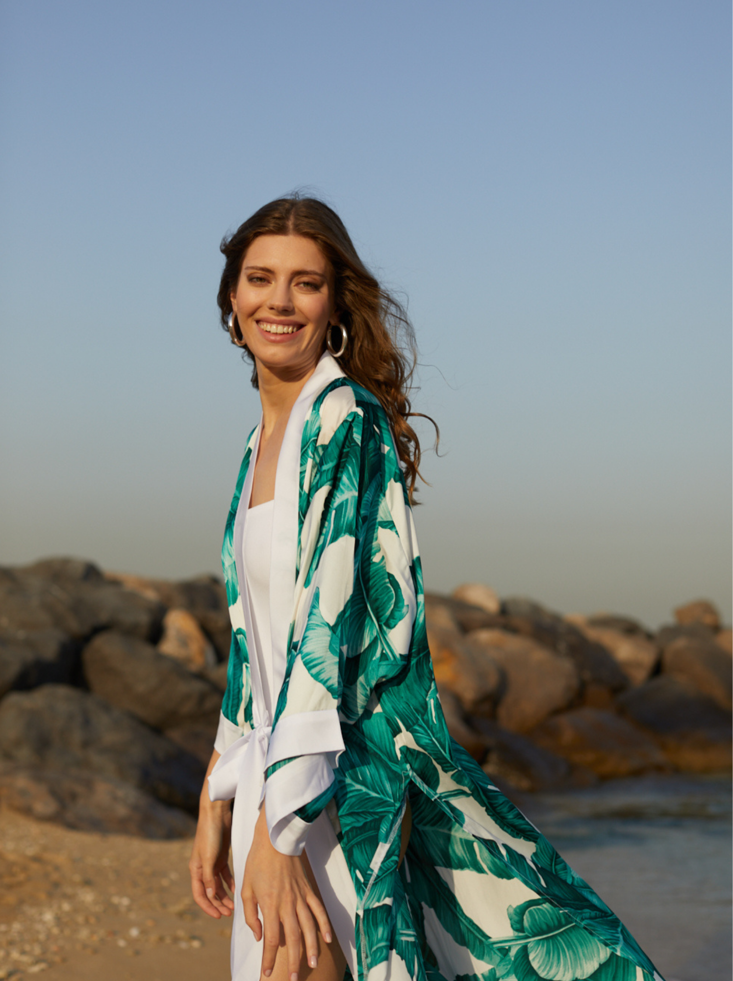 The Sara Kimono design is the perfect robe, feminine and practical. Printed Silk in beautiful tropical green leaves, open on the sides and with a belt in the front to adjust it to your shape or keep it lose.