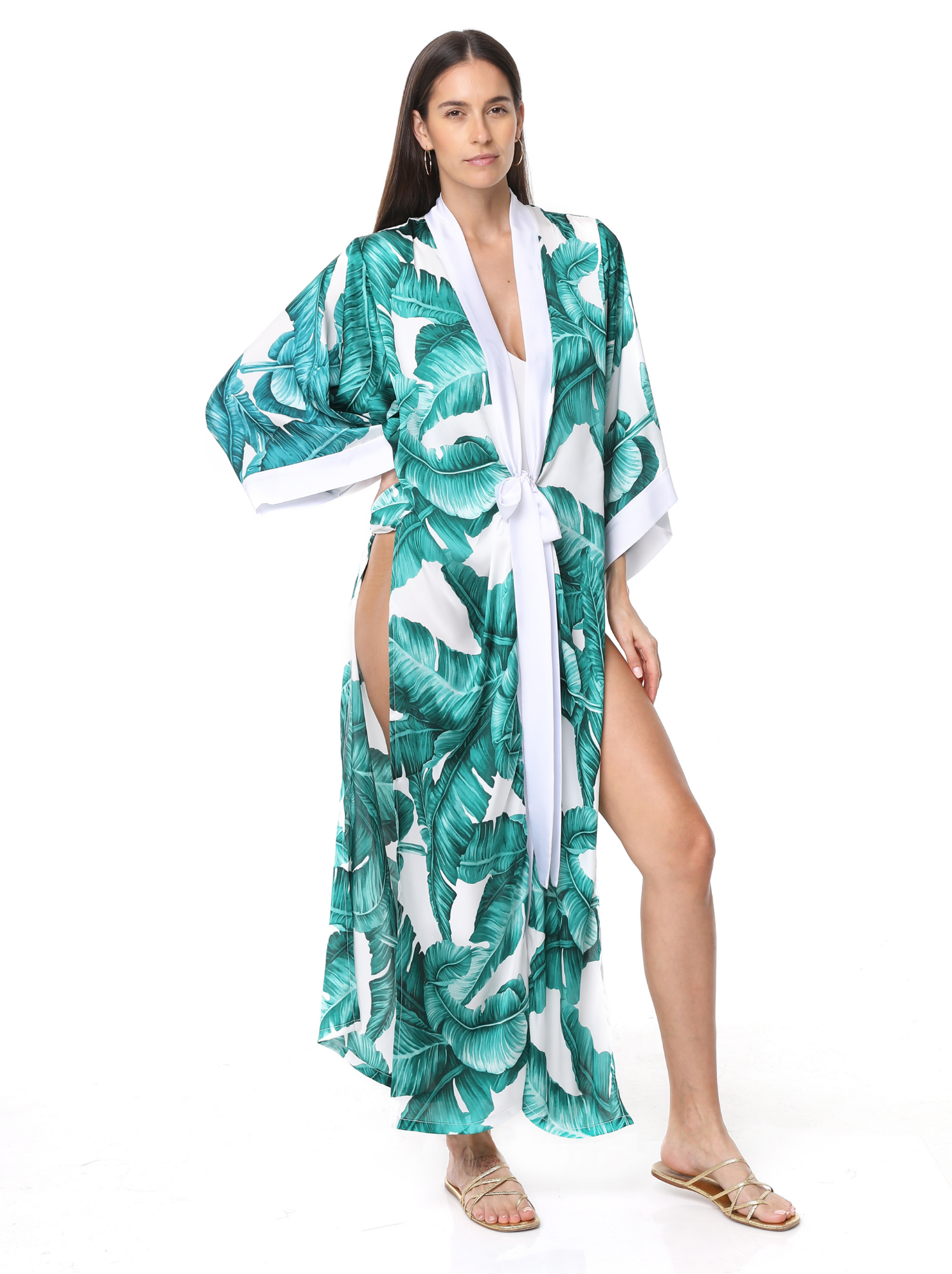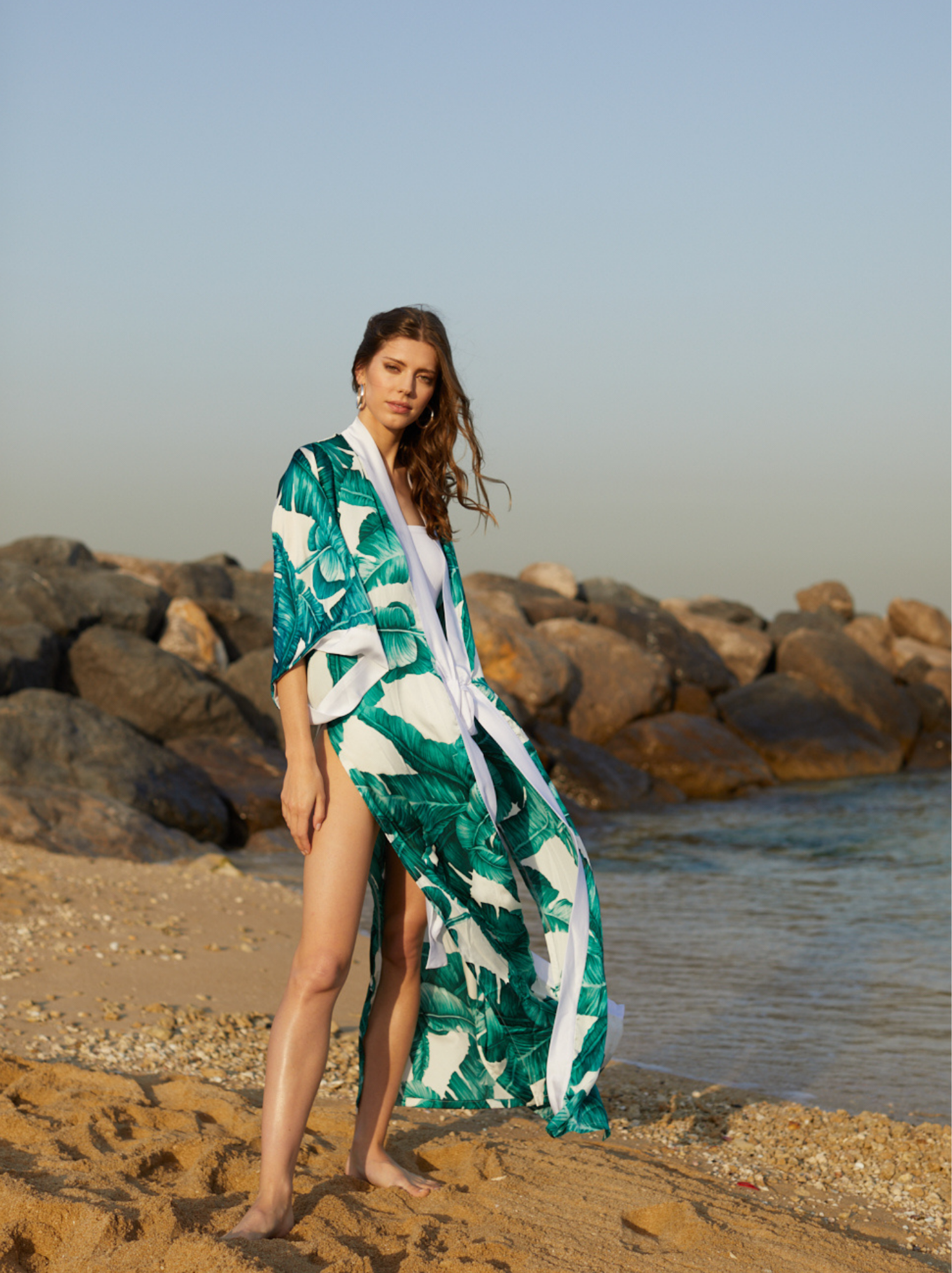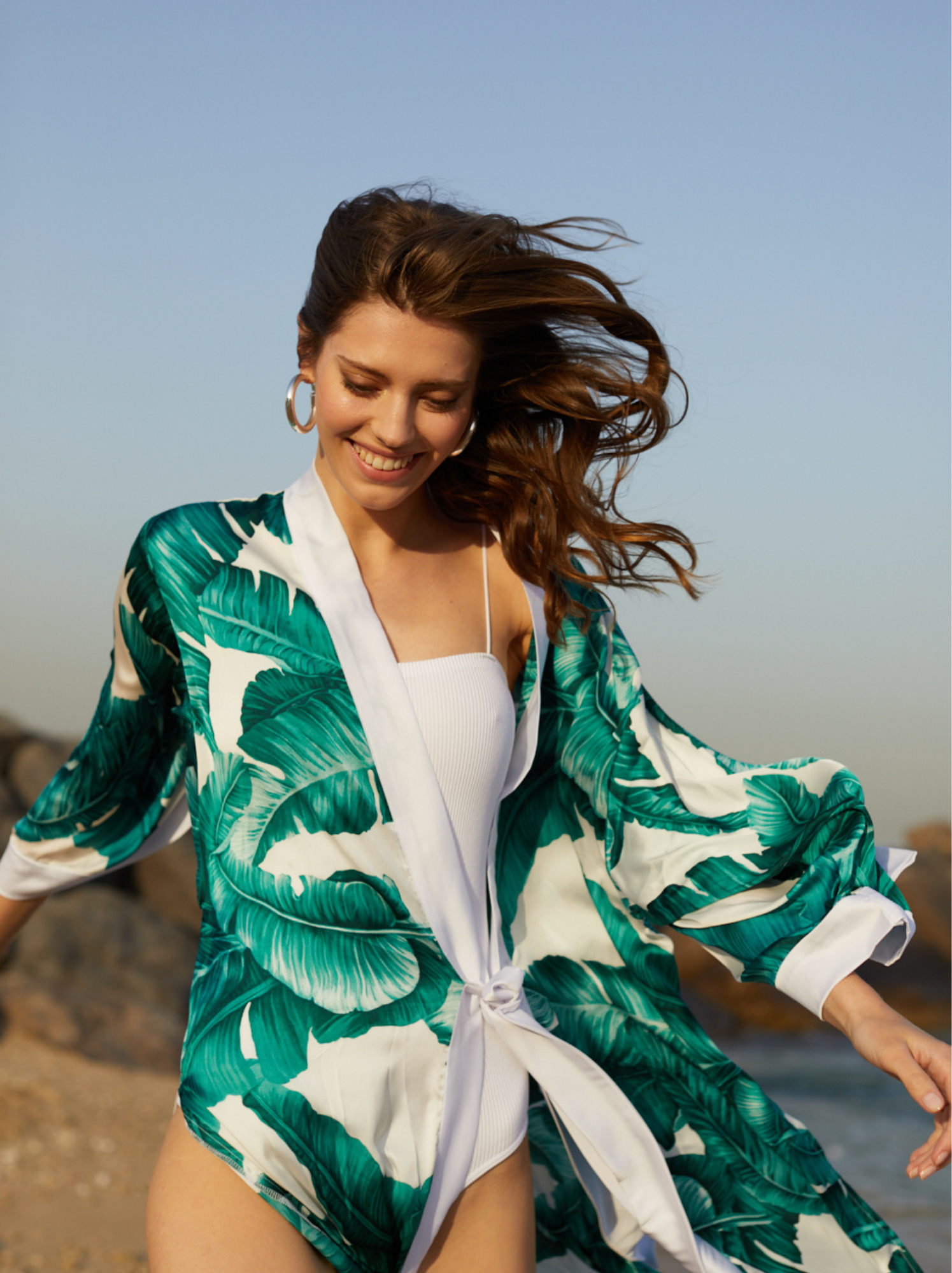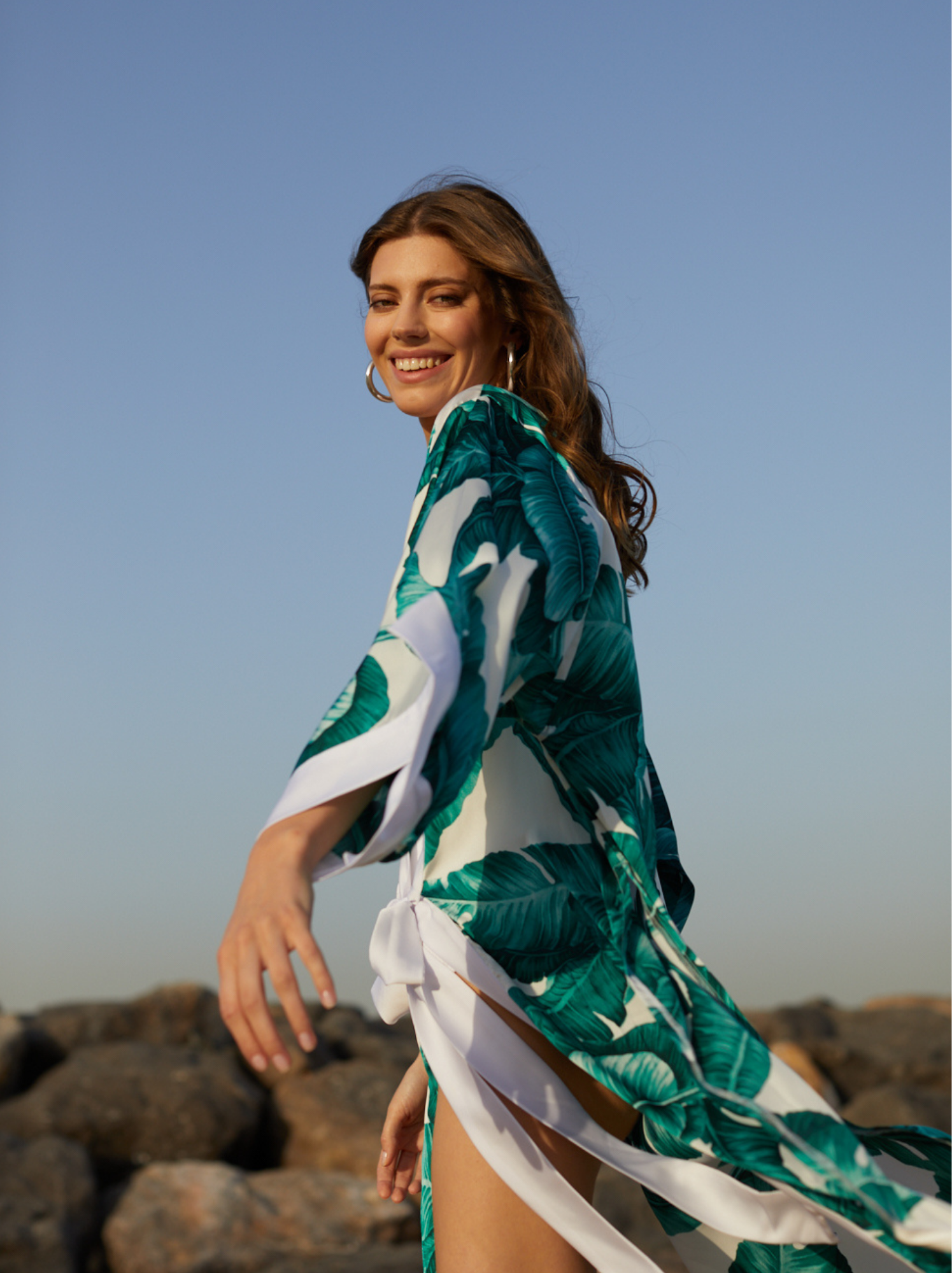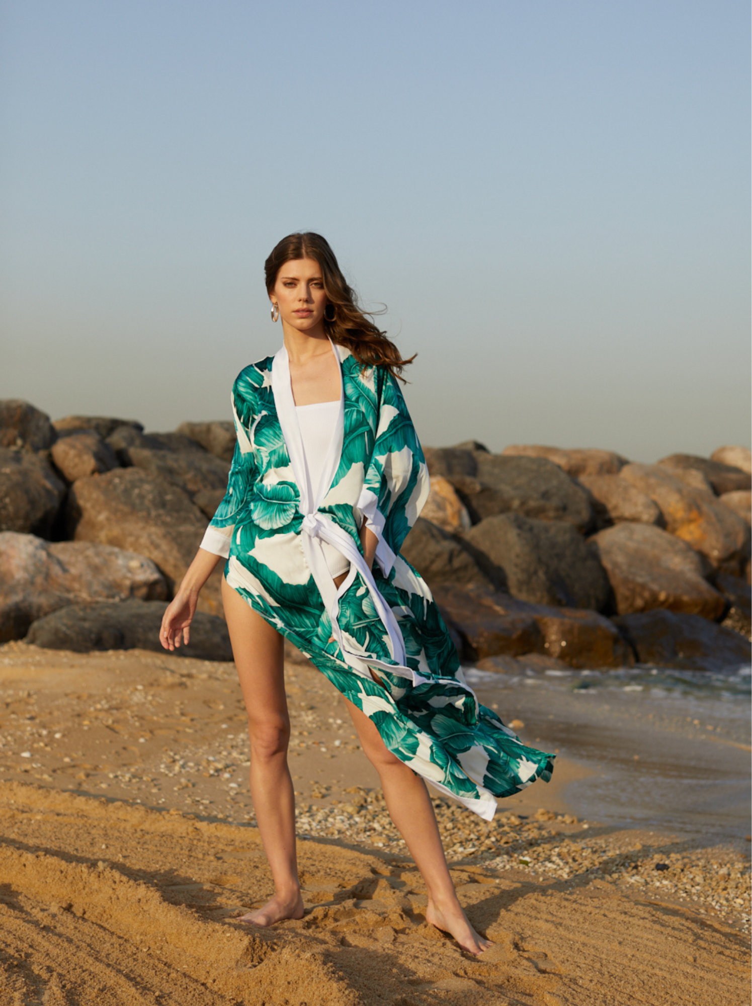 The Sara Kimono design is the perfect robe, feminine and practical. Printed Silk in beautiful tropical green leaves, open on the sides and with a belt in the front to adjust it to your shape or keep it lose.