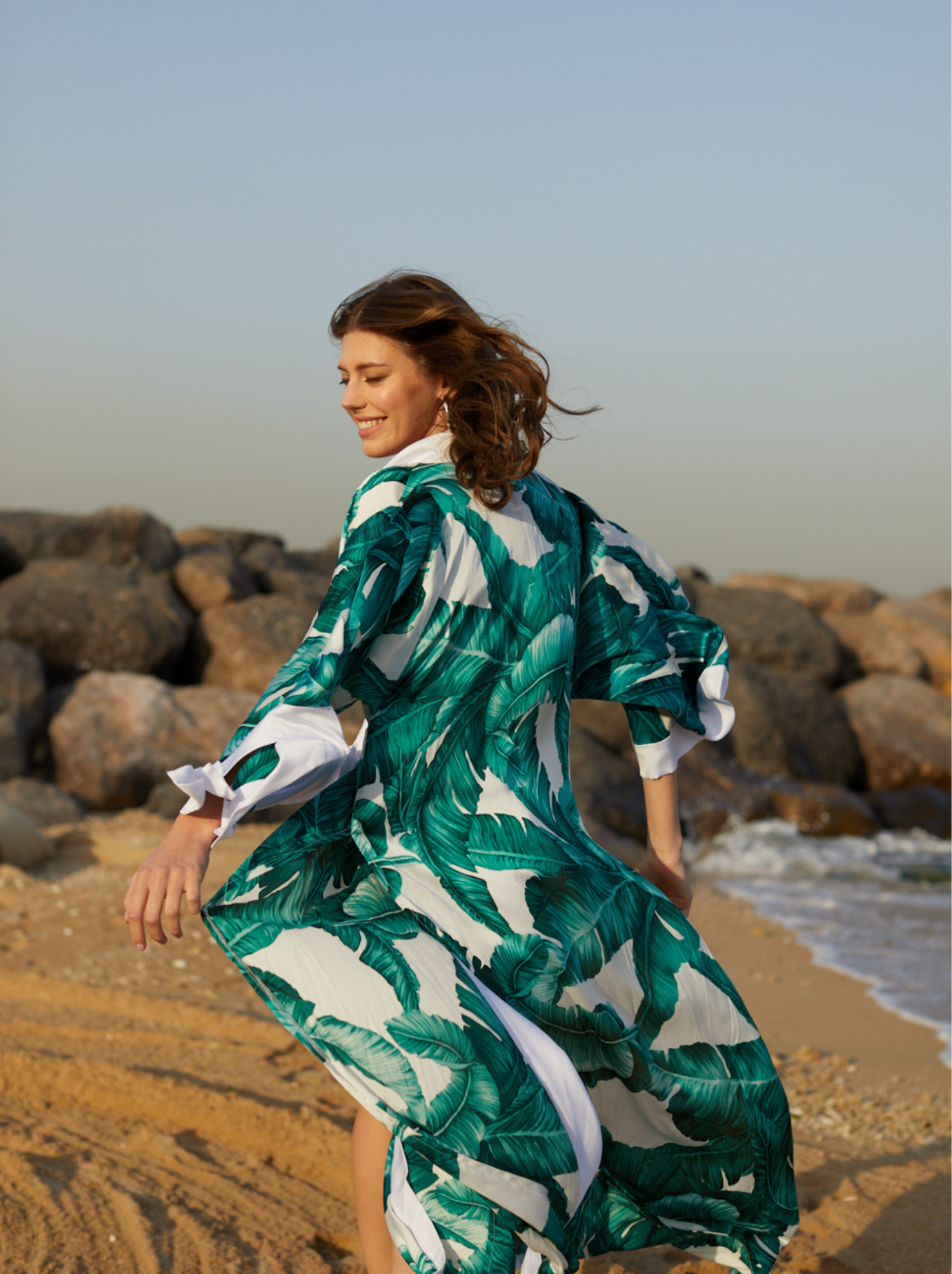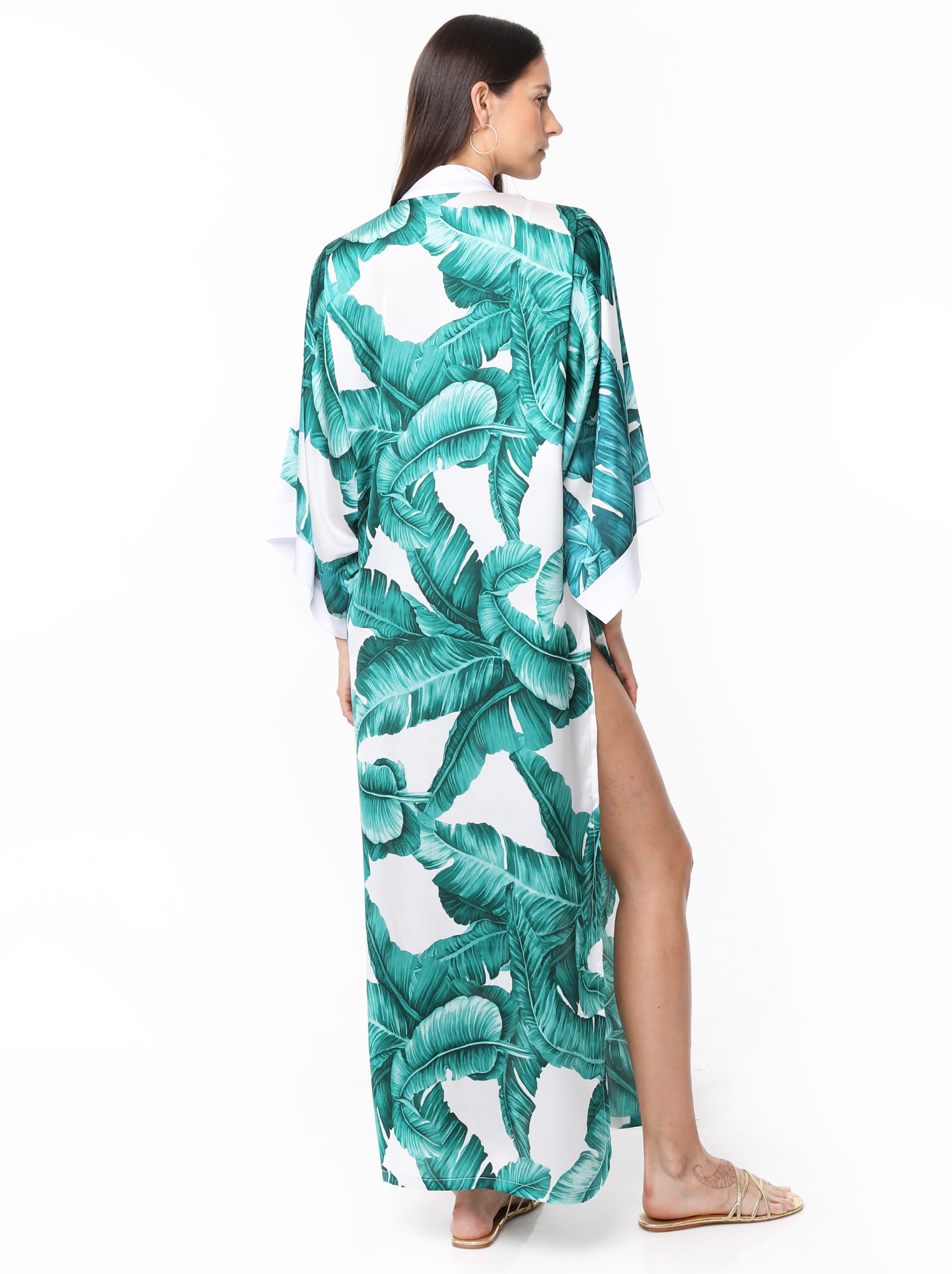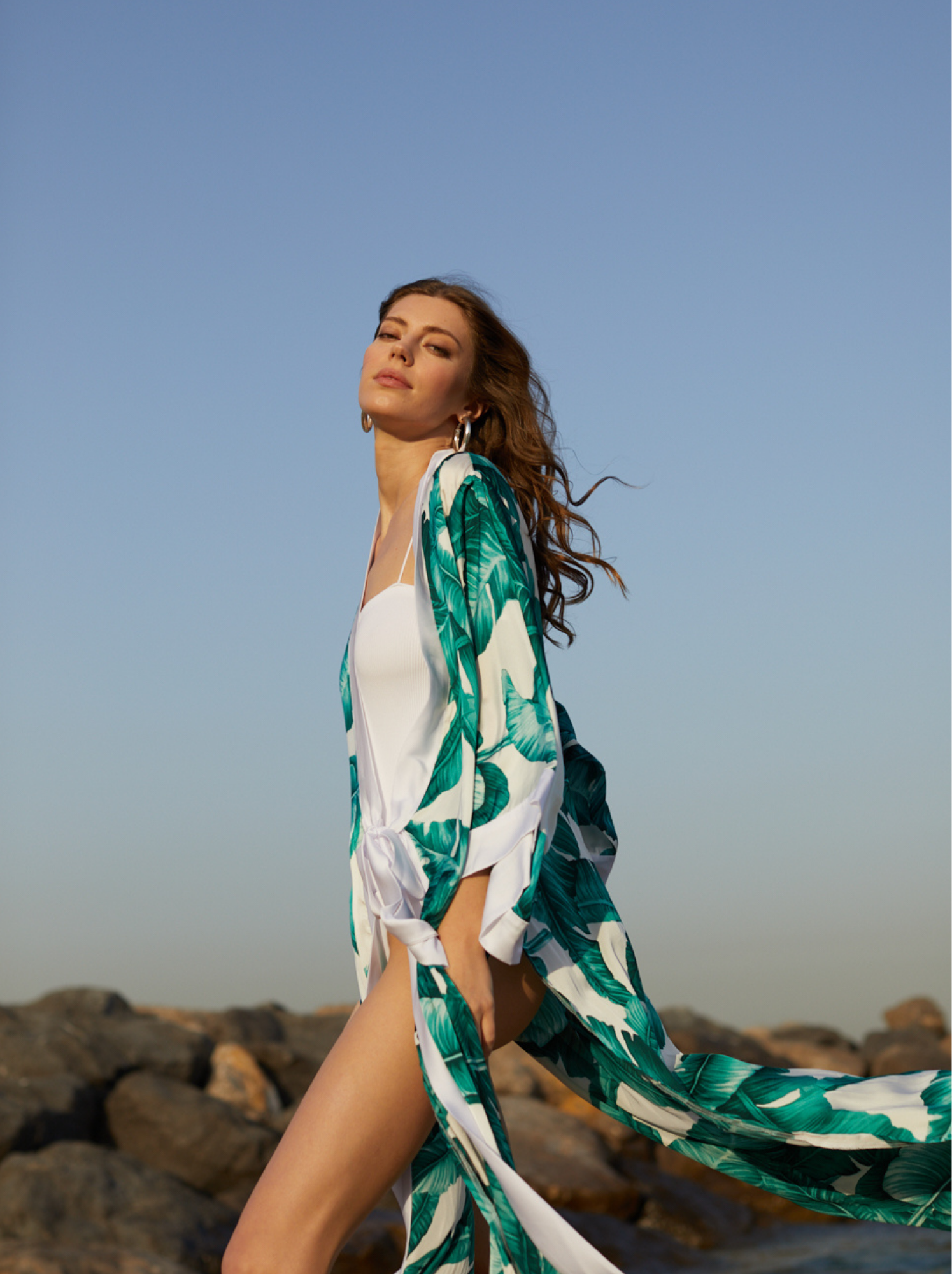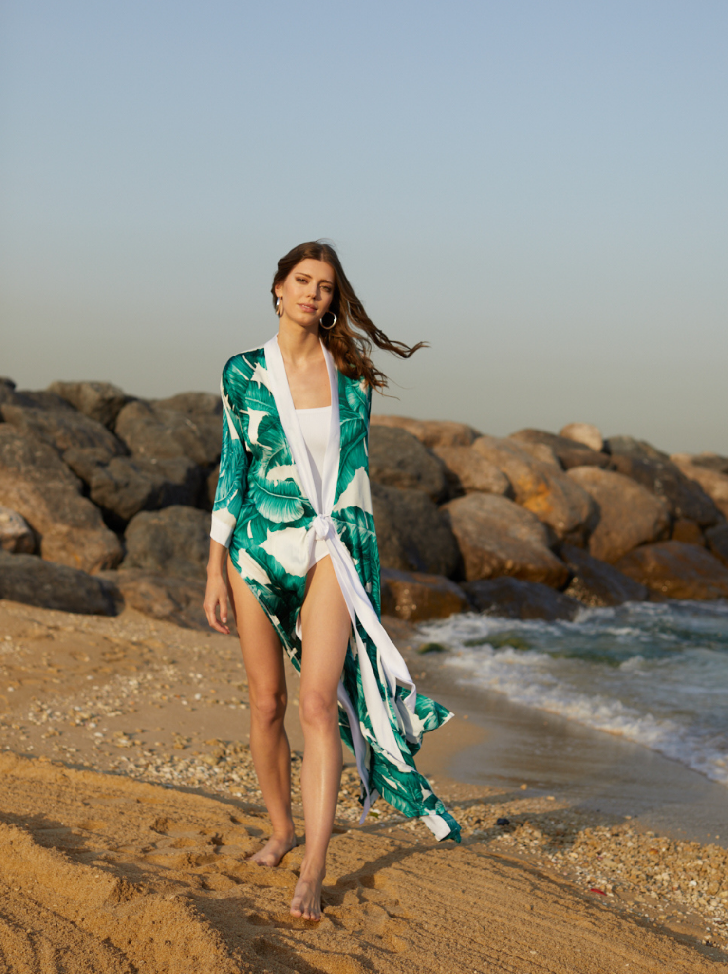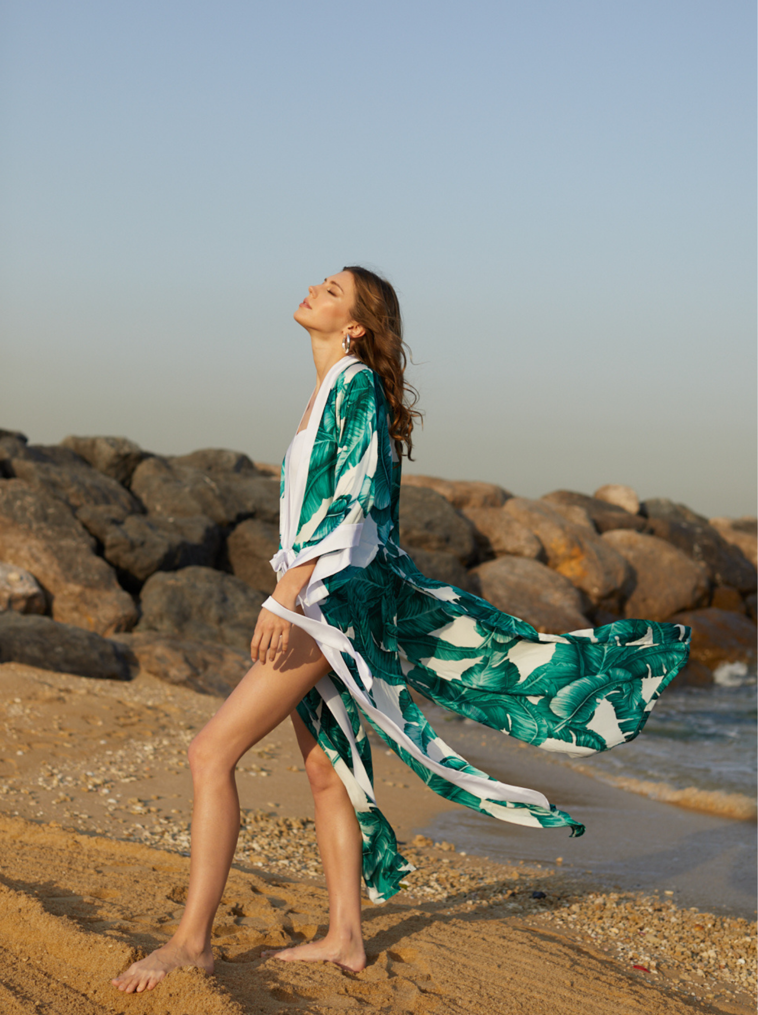 The Sara Kimono design is the perfect robe, feminine and practical. Printed Silk in beautiful tropical green leaves, open on the sides and with a belt in the front to adjust it to your shape or keep it lose.
