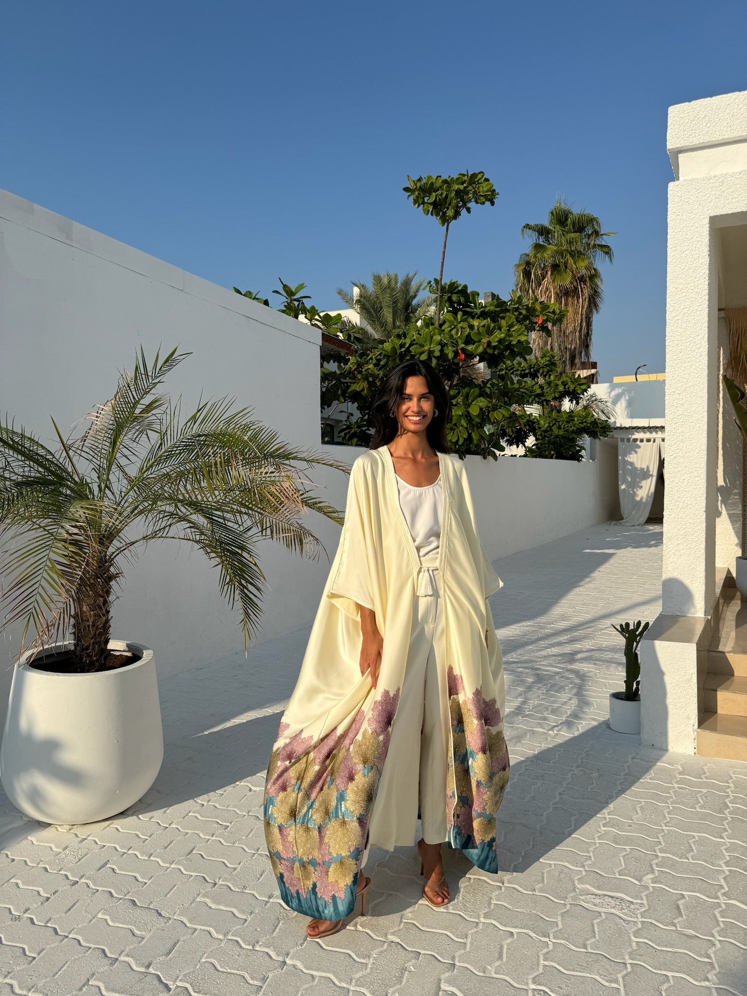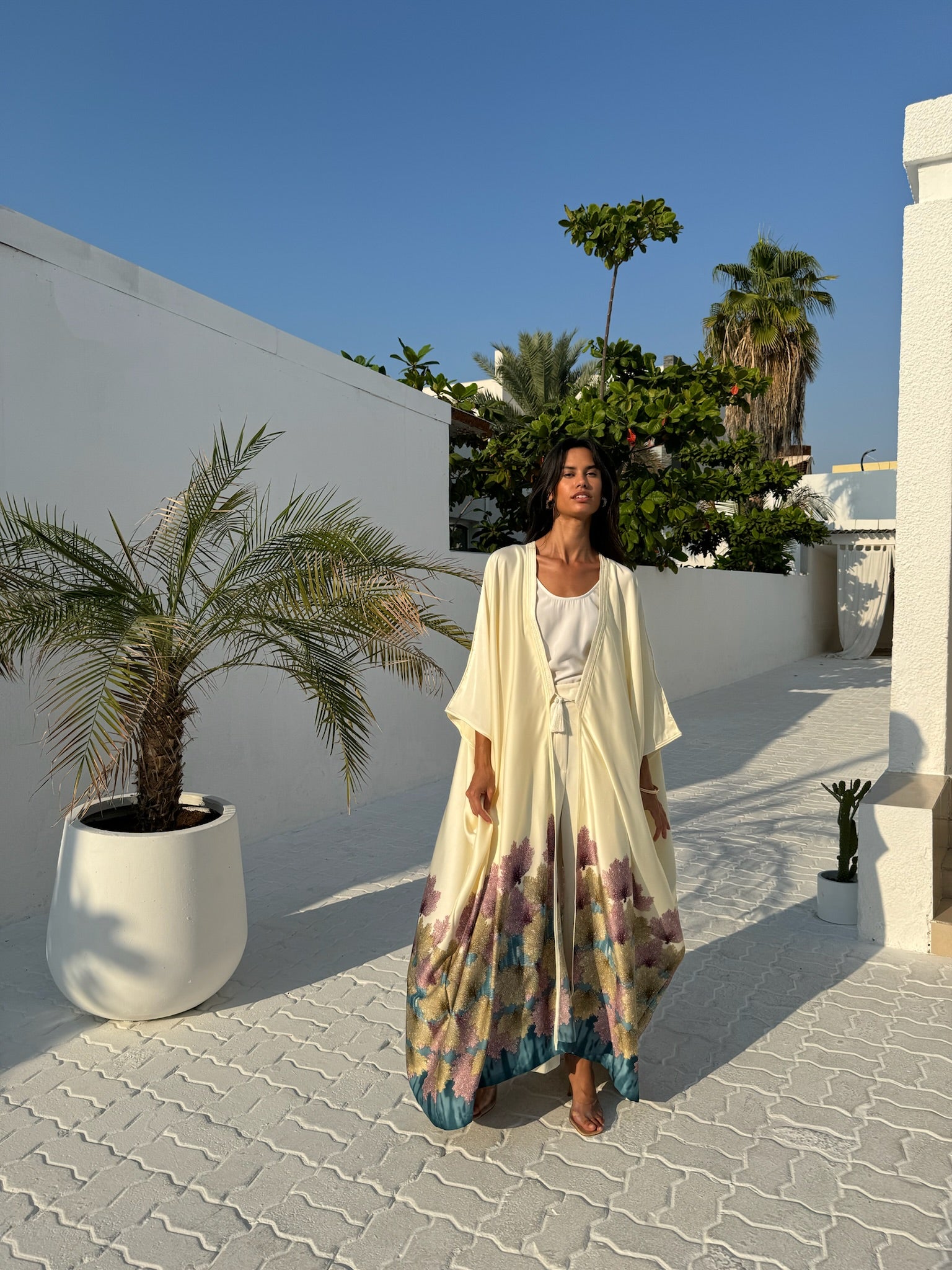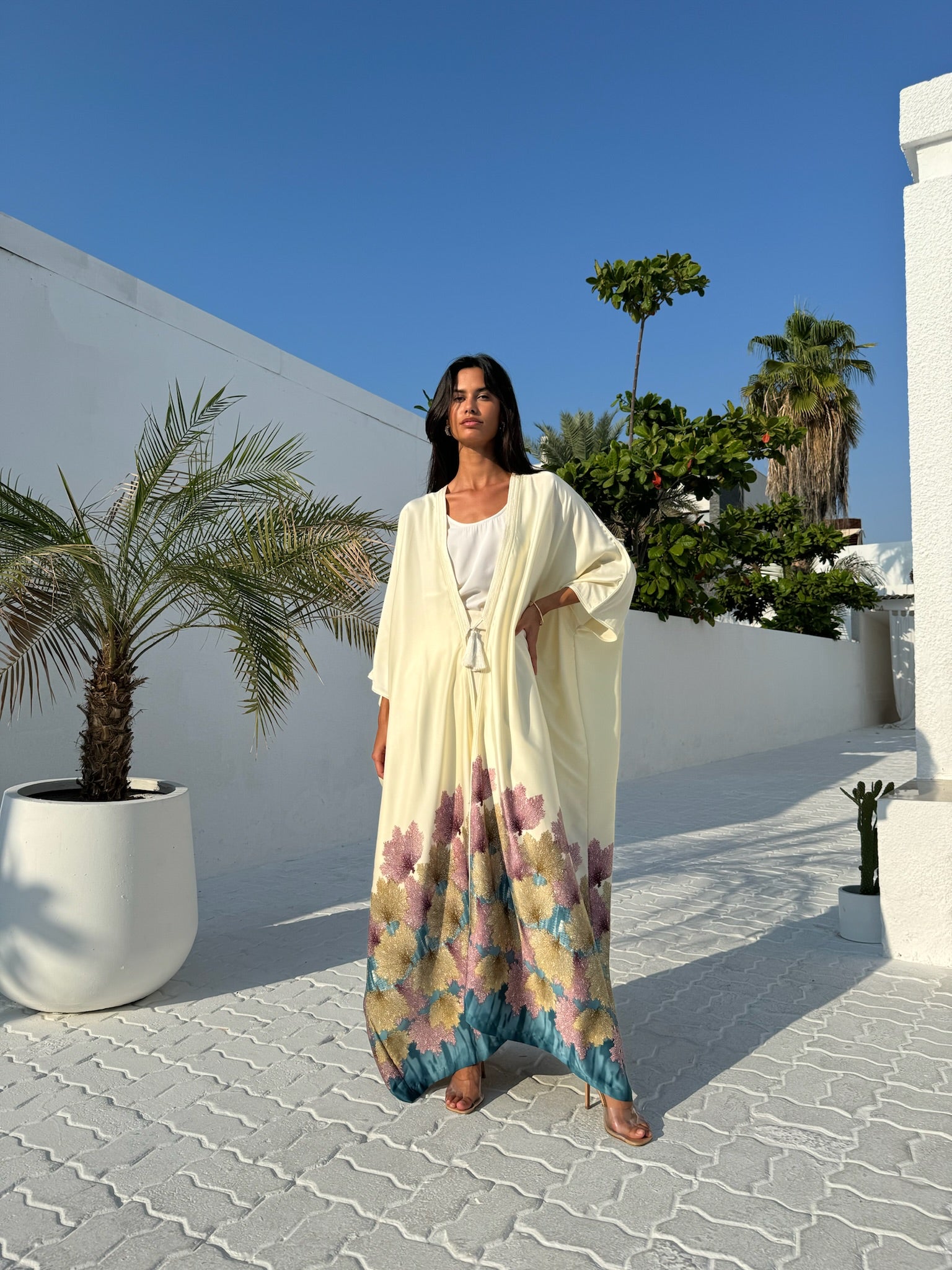 The Silk Tunic will elevate your modest-wear collection with this beautiful printed silk at the bottom of the design. Crafted from a silk fabric, cut for an exceptional fluid movement and tasseled with handmade trims on the lapel all the way down along the front.