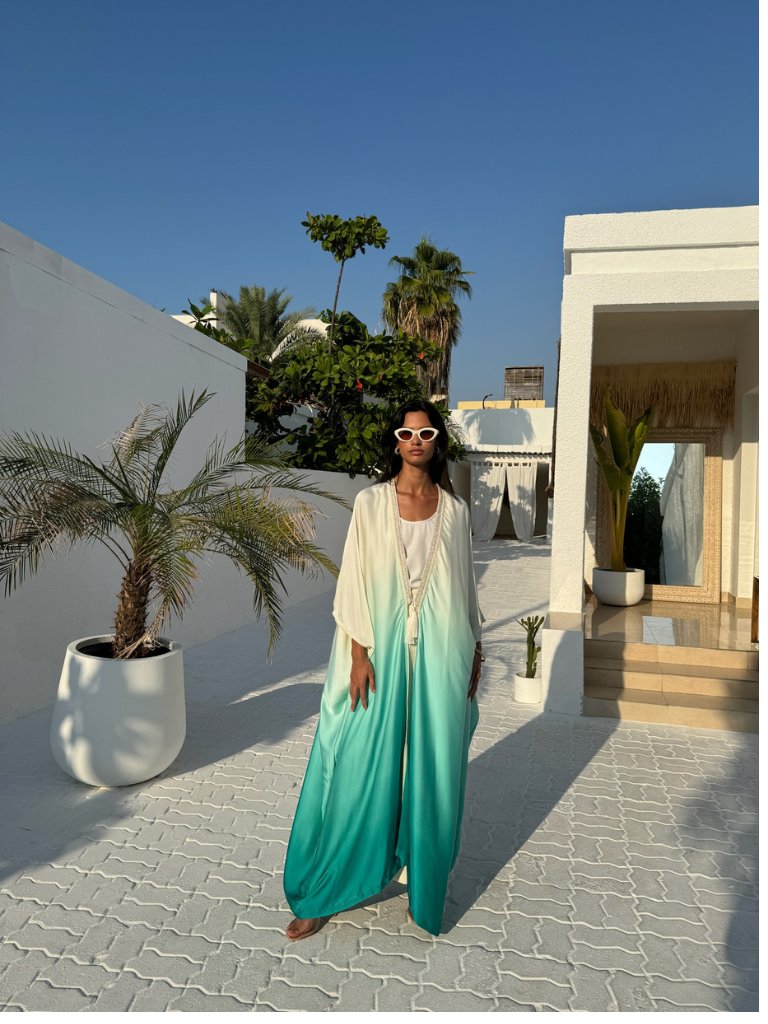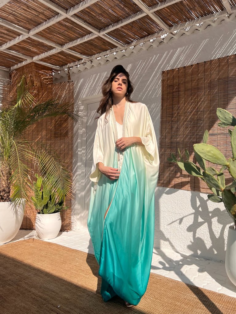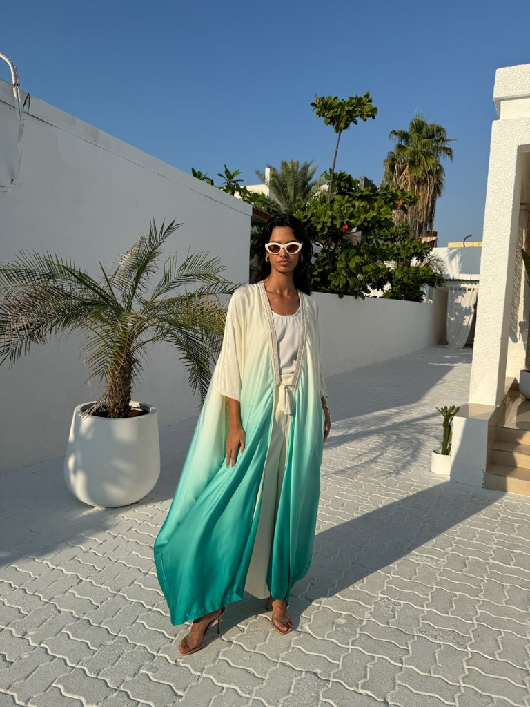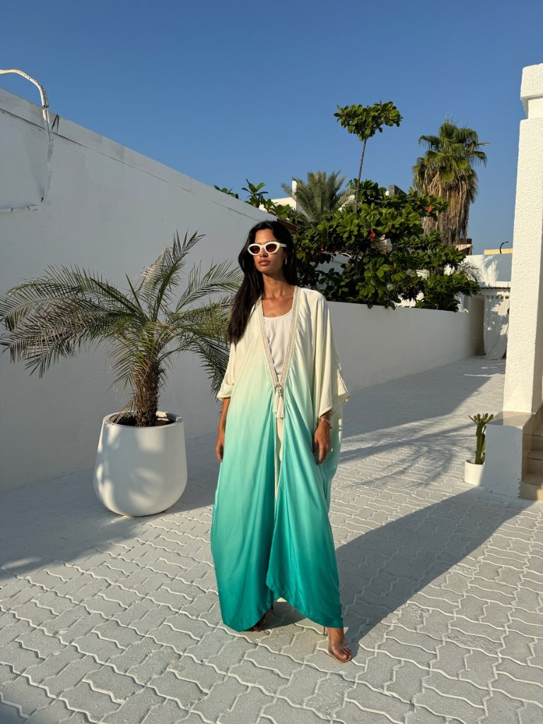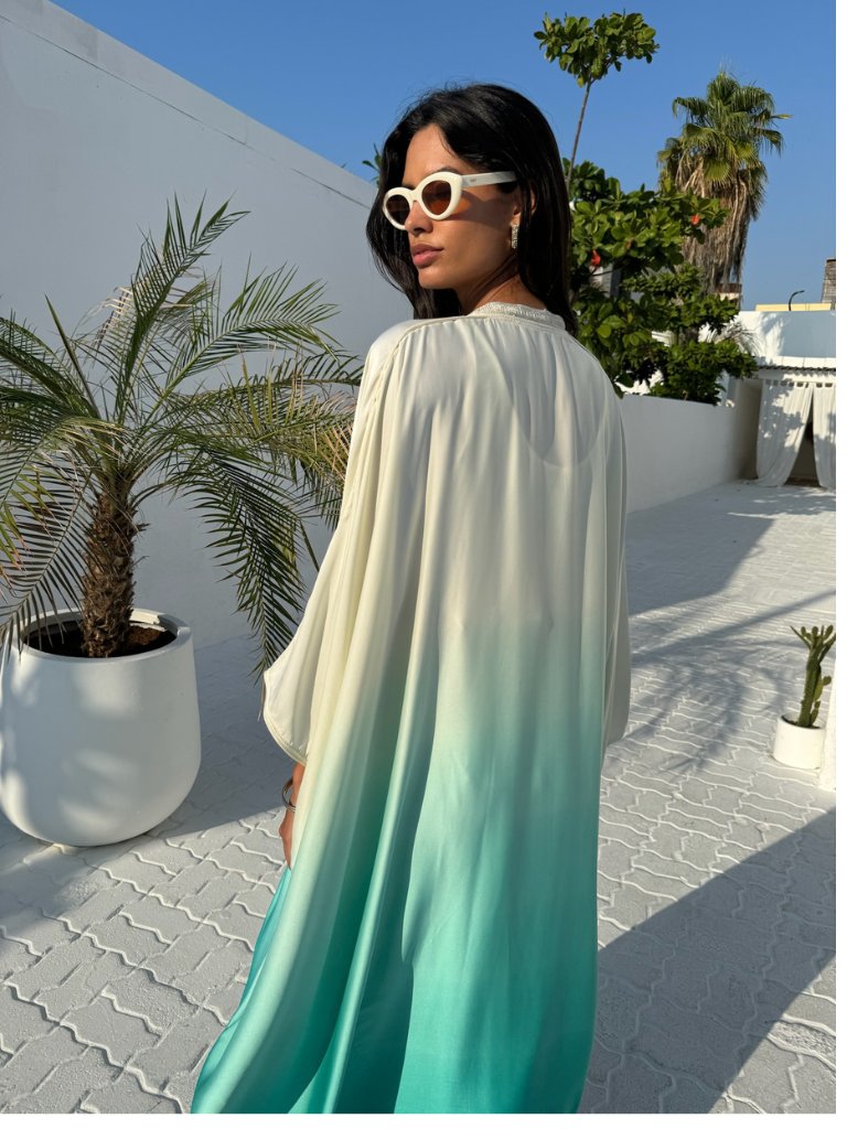 The new colorful Ombree Silk Tunic will brighten up your modest-wear collection. Crafted from a silk fabric, cut for an exceptional fluid movement and tasseled with handmade trims on the lapel all the way down along the front. Green color combined with silver trims.