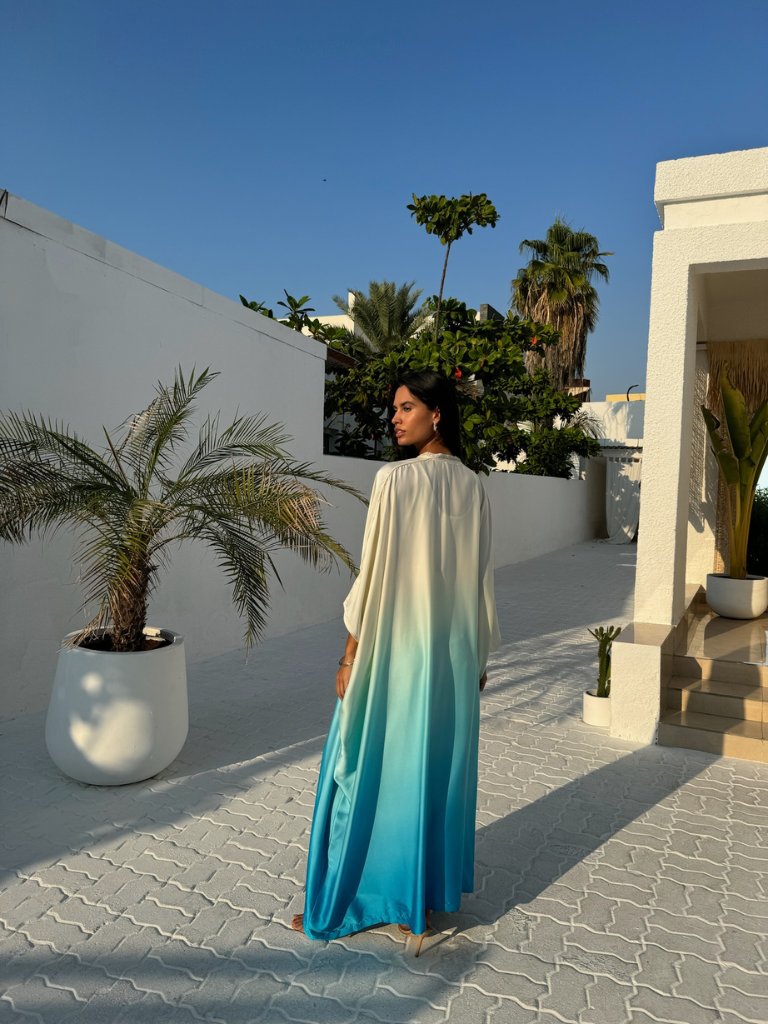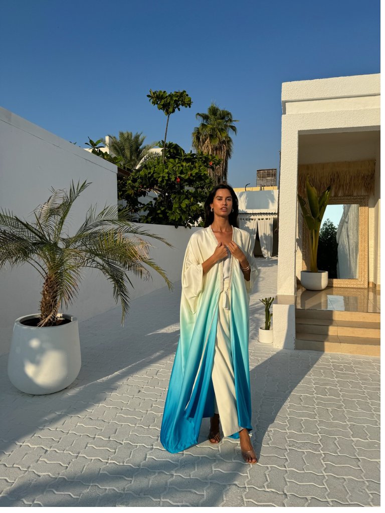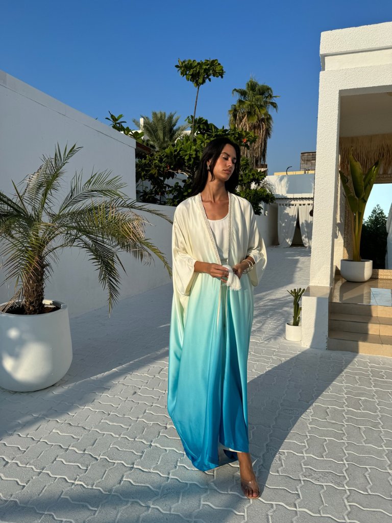 The new colorful Ombree Silk Tunic will brighten up your modest-wear collection. Crafted from a silk fabric, cut for an exceptional fluid movement and tasseled with handmade trims on the lapel all the way down along the front. Blue color combined with silver trims.