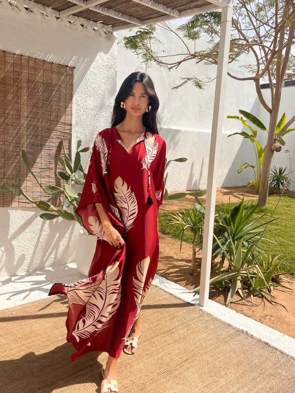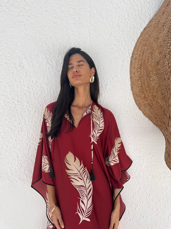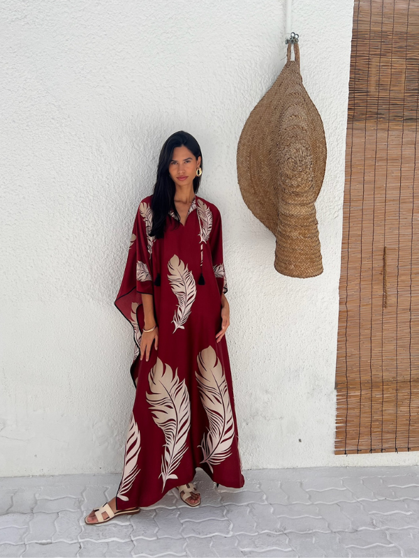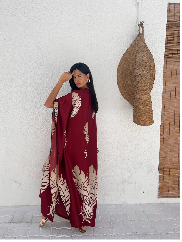 Our timeless, feminine and flowy designs, with beautiful and elegant printed silks, are a must have in all modest-wear collections. Classy burgundy color with a V-neckline holding our signature black tassels giving a perfect look.